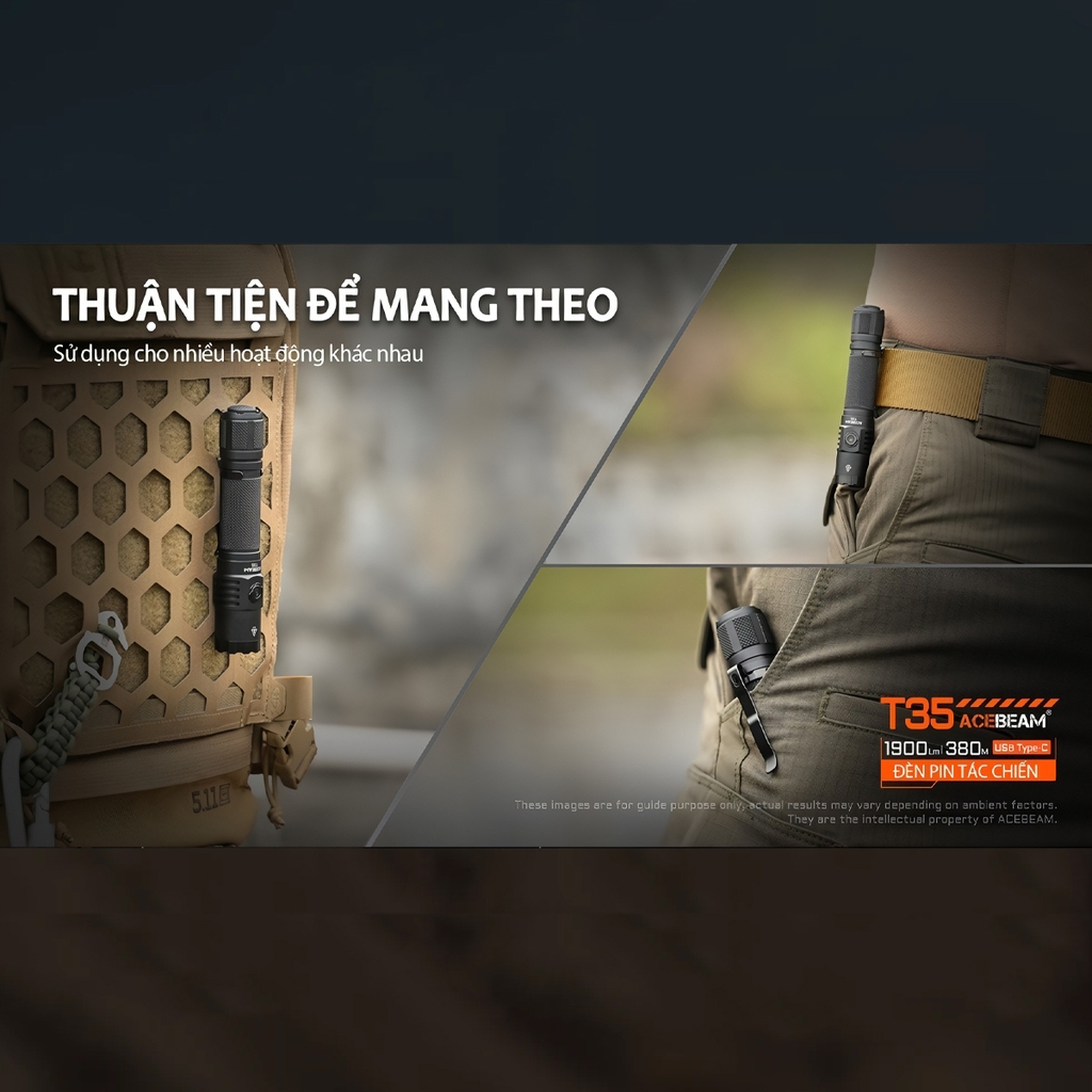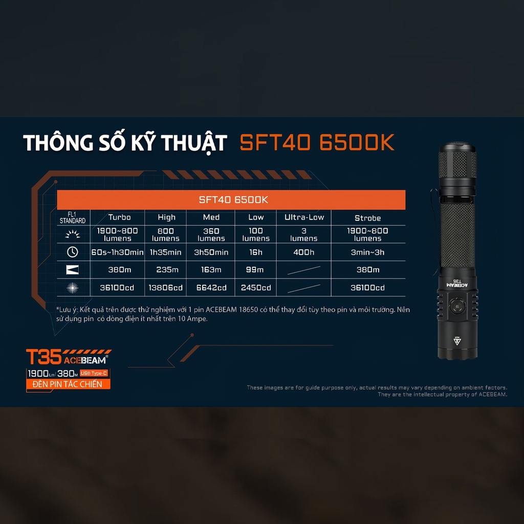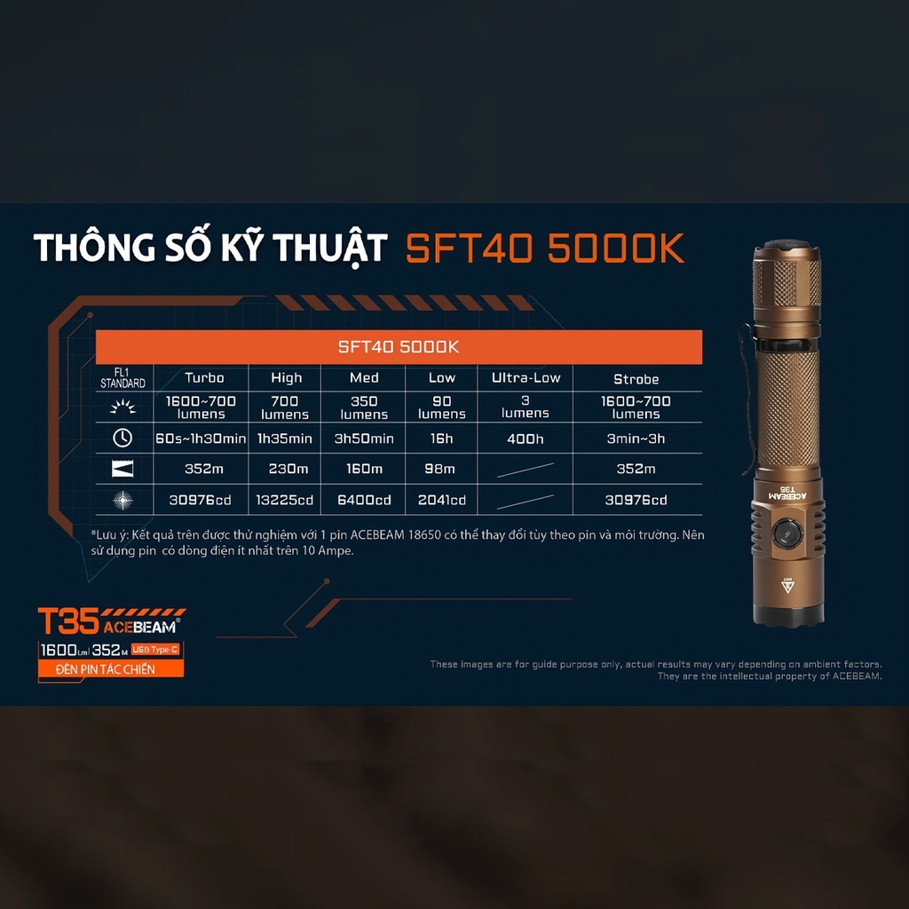 ACEBEAM T35 là mẫu đèn pin tác chiến cỡ nhỏ, trang bị LED Luminus SFT40 với hai tuỳ chọn nhiệt màu: 6500K cho độ sáng tối đa 1900 lumen – chiếu xa tới 380m, và 5000K cho độ sáng 1600 lumen – tầm xa 352m. Đèn vận hành bằng 1 pin 18650 dung lượng 2600mAh với thời gian sử dụng lên đến 400 giờ ở mức sáng thấp, hoặc có thể dùng 2 pin CR123A thay thế.