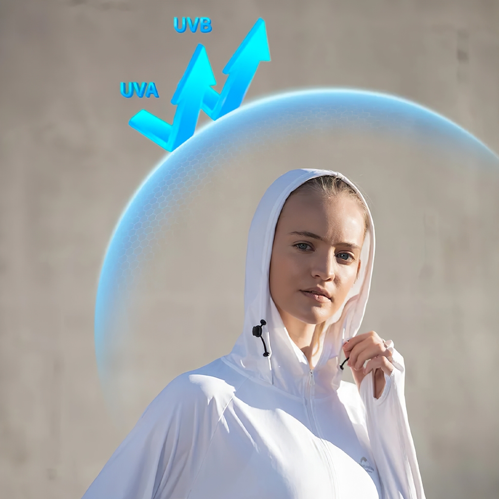 Chất liệu chống nắng đạt chuẩn UPF50+ giúp chống tia tử ngoại (UV) lên đến 98.5% và đạt đủ các chứng nhận đánh giá về đặc tính bảo vệ bức xạ tia cực tím mặt trời.