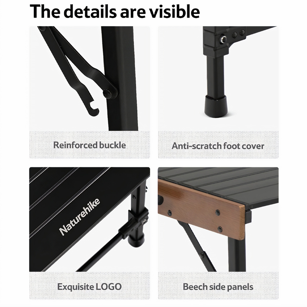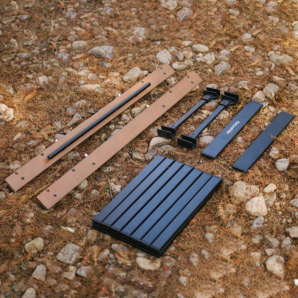 Hai cặp chân bàn tháo rời, thanh nối ngang hợp kim, 3 mặt bàn ghép hợp kim nhôm trên video sử dụng Bếp nướng than hoa gấp gọn Glamping NatureHike NH20CJ006 (bếp mua riêng) |
