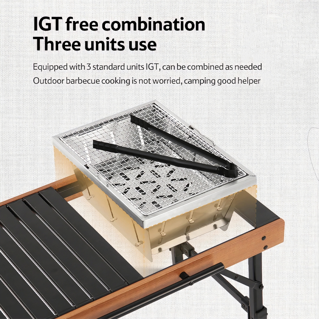 Sản phẩm bàn hợp kim nhôm Naturehike Glamping NH21JU011. Còn được sản xuất kèm một sản phẩm bếp nướng than hoa, cùng một mẫu bếp gas mang đi cắm trại. Kích thước vừa vặn, khớp với chính một tấm mặt bàn từ nhôm được tháo ra. Thay vào đó một trong hai sản phẩm kể trên.