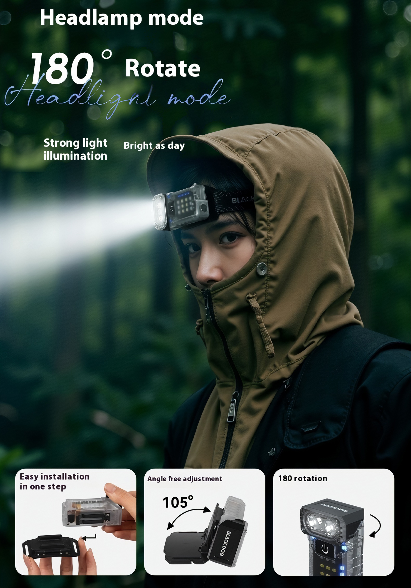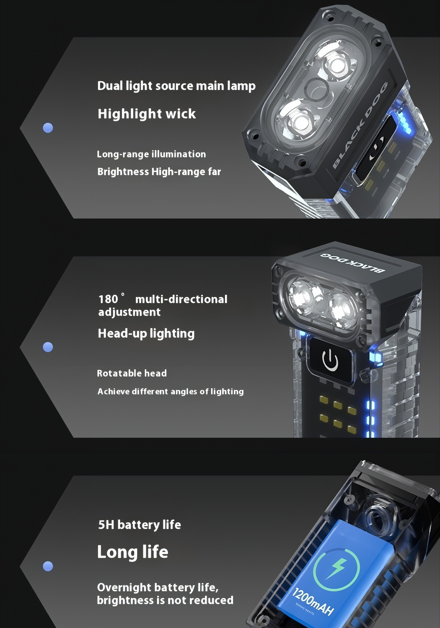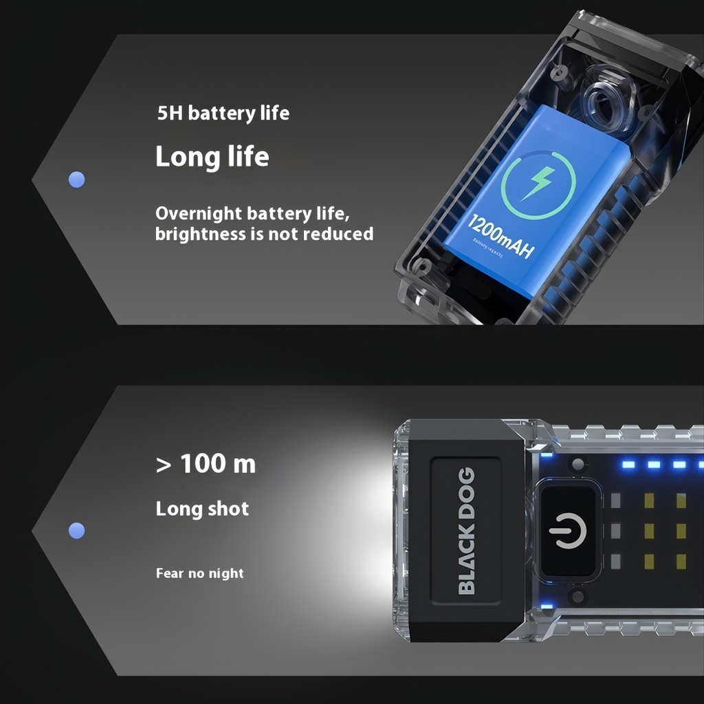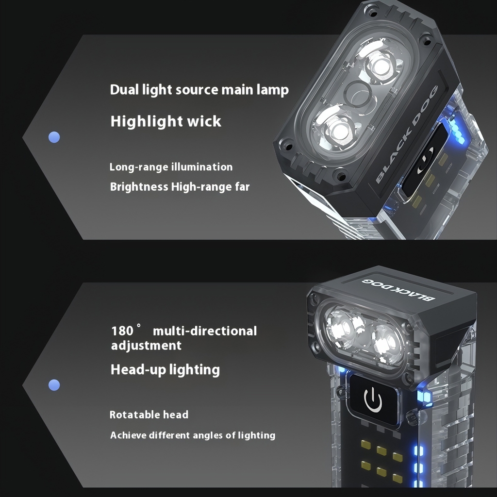 🔦 Đầu đèn xoay 90° cho nhiều tư thế sử dụng, dễ cố định khi thao tác hoặc gắn lên balo, túi áo.