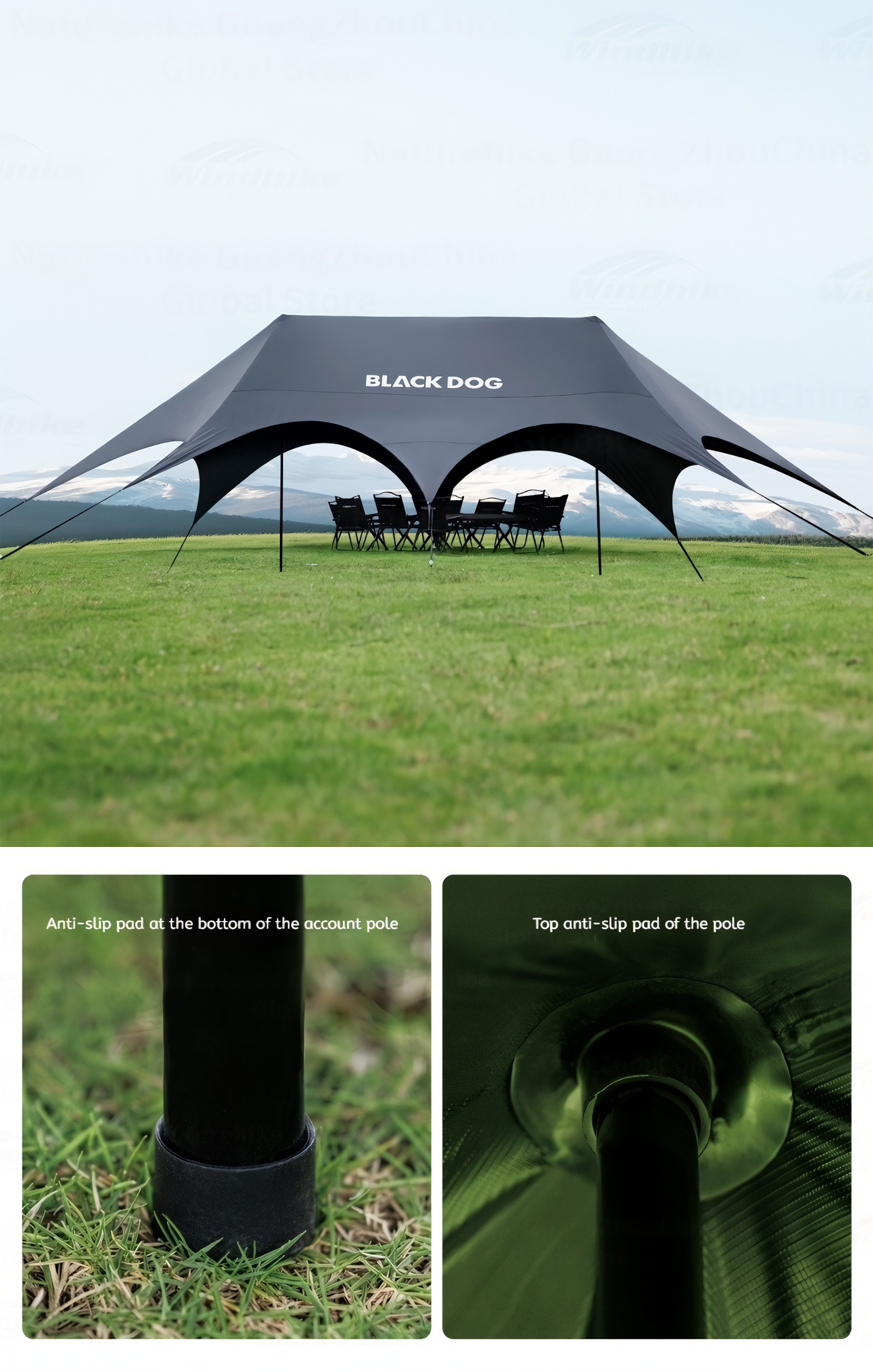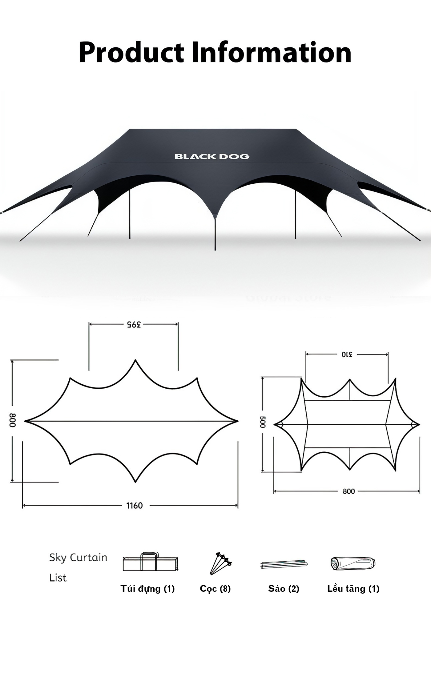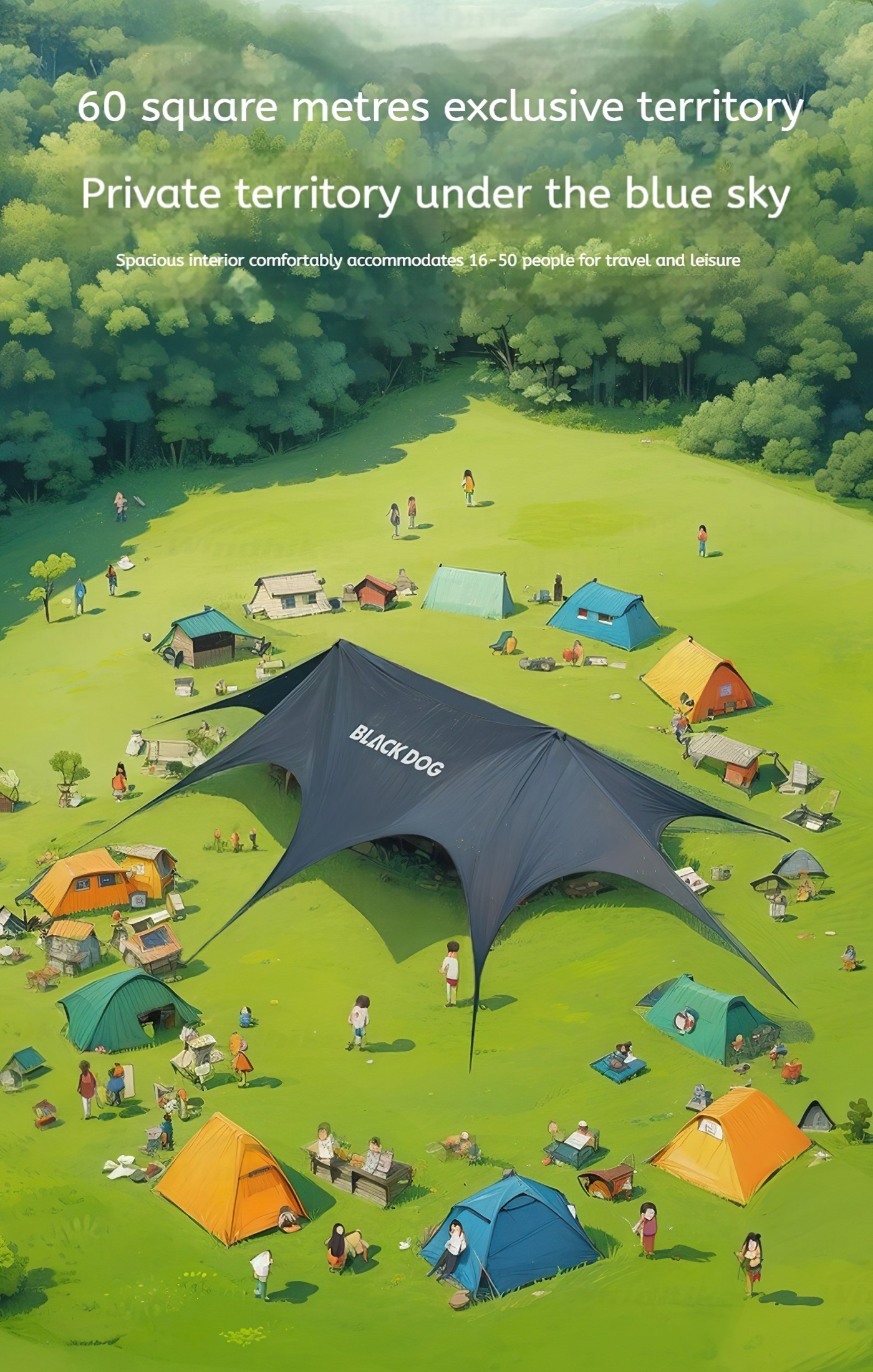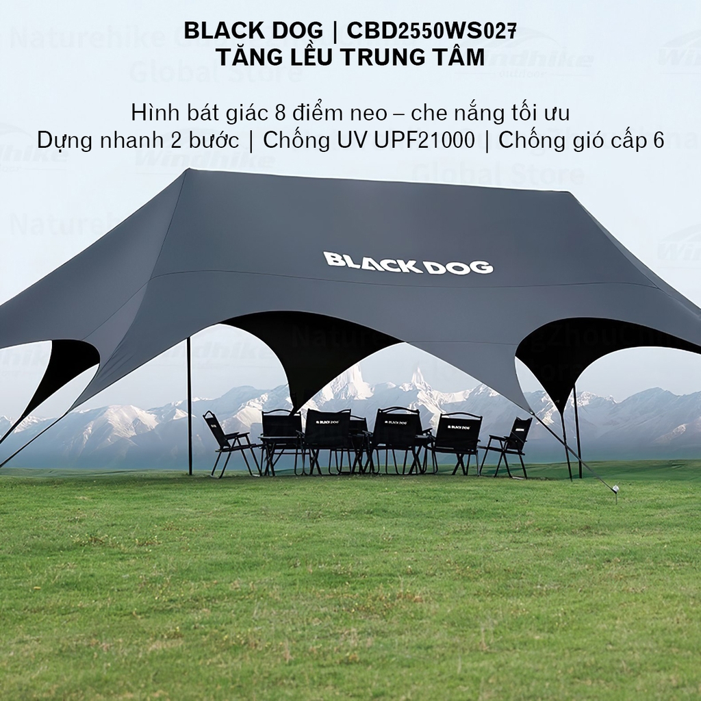 Tấm tăng lều trung tâm BLACKDOG CBD2550WS027 có kích thước rộng 8 x 5 m, chiều cao sào chống đạt 2,6 m, mang lại không gian che phủ lớn tương đương một rạp dã ngoại cỡ nhỏ. Kiểu dáng bát giác bo cạnh giúp bề mặt căng đều, kết hợp 8 điểm cố định vững chắc, đảm bảo độ ổn định khi sử dụng. Sản phẩm rất phù hợp cho team building, dã ngoại tập thể, hoạt động công ty hoặc các buổi sinh hoạt ngoài trời của gia đình đông thành viên.