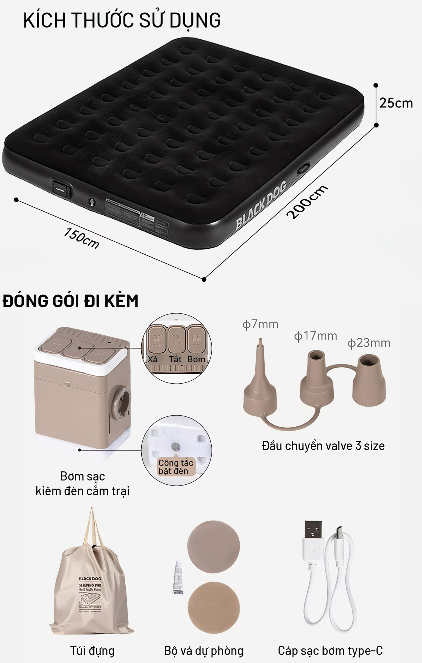 Nệm dã ngoại BLACKDOG CBD2550WS037 là mẫu nệm cao cấp được trang bị bơm sạc tích hợp đèn cắm trại, mang đến sự tiện nghi và hiện đại trong quá trình sử dụng. Sản phẩm phù hợp để ngủ trong lều, dùng tại nhà hoặc trong những chuyến dã ngoại cùng gia đình, bạn bè.