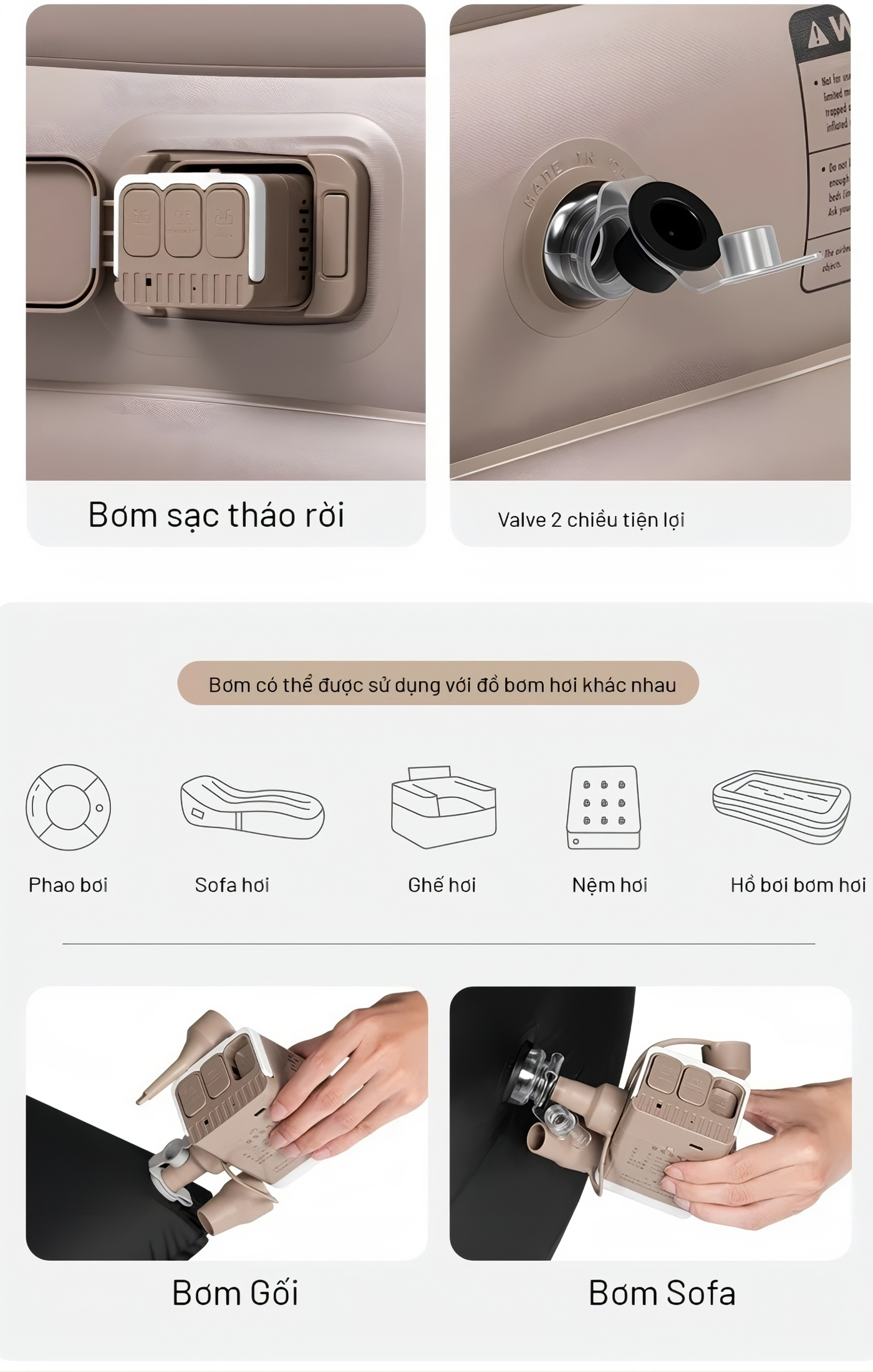 Bề mặt nệm sử dụng chất liệu Viscose mềm mại, thân thiện với làn da, tạo cảm giác dễ chịu và giúp giấc ngủ thoải mái hơn. Khi được bơm căng, nệm có kết cấu vững chắc, khả năng chịu lực tốt, độ cứng và độ ổn định tương đương nệm lò xo, mang lại trải nghiệm nghỉ ngơi êm ái và an tâm.