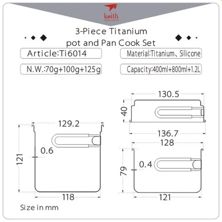 Bộ Nồi Và Chảo 3 Món Keith Titanium 2.4 L được làm bằng titan nguyên chất cao cấp loại 1 không có lớp lót và lớp phủ, không mùi, không độc hại và an toàn cho máy rửa chén. Sử dụng tiện lợi khi đi du lịch, cắm trại, dã ngoại. Titanium siêu nhẹ và siêu bền; thân thiện với môi trường, đặc biệt ít gây dị ứng và đặc biệt chống ăn mòn