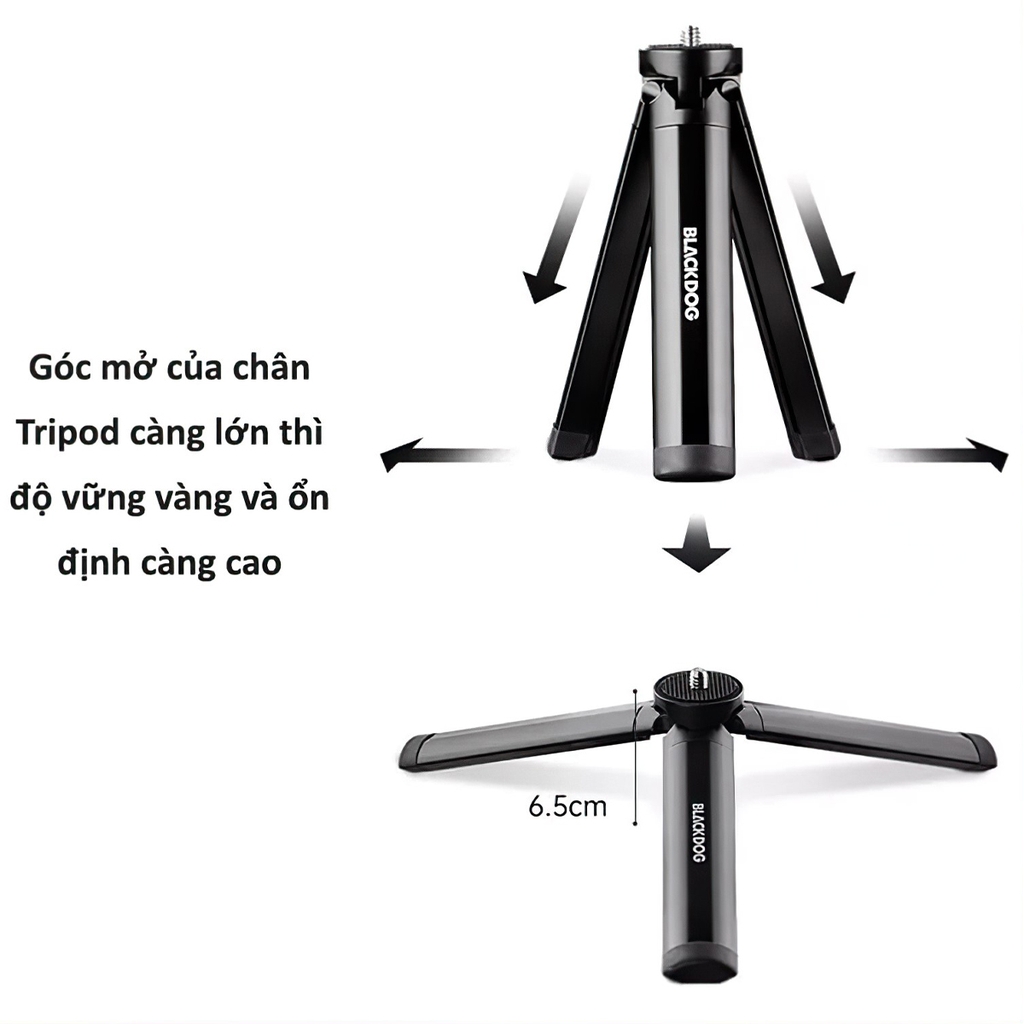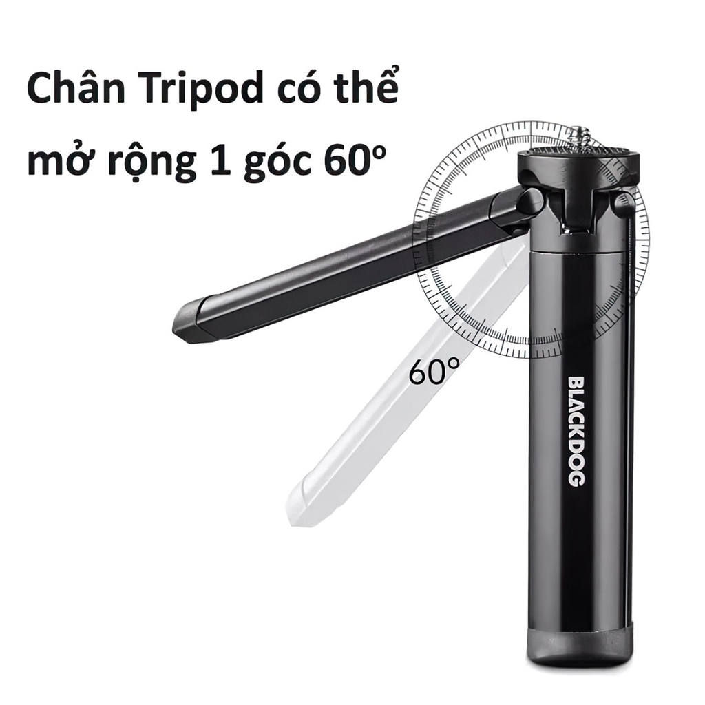 các loại đèn pin, camera, điện thoại...thông qua chân ren ốc. Tripod sử dụng chất liệu chính là hợp kim nhôm siêu nhẹ chỉ 165 grams và được gia công sắc sảo và sang trọng. Với màu sắc là màu đen đặc trưng của thương hiệu BlackDog càng làm cho sản phẩm có vẻ ngoài thêm phần chắc chắn và cứng cáp.