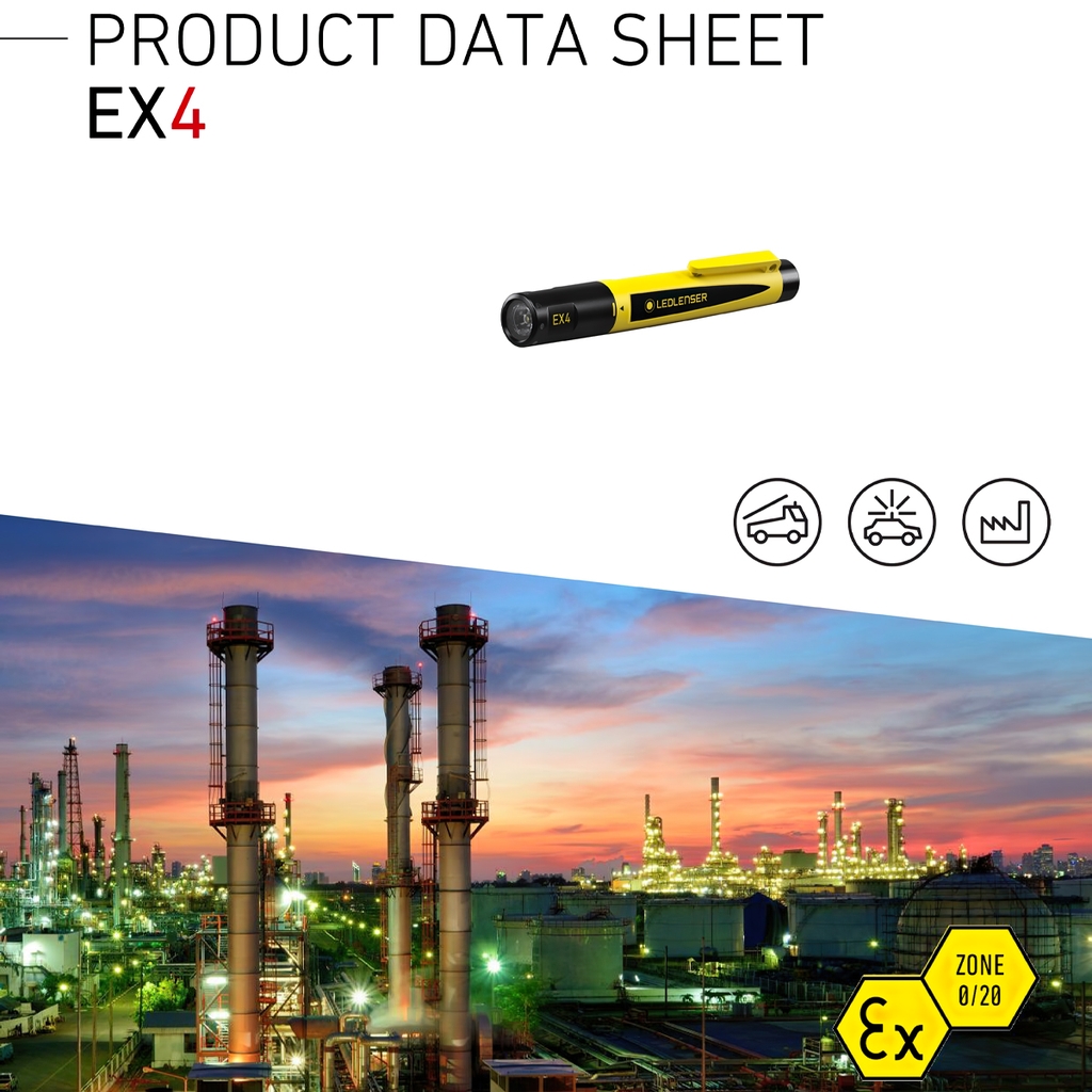Với độ sáng cực kỳ tốt, cực kỳ nhỏ, cực kỳ tiện lợi và hoàn toàn phù hợp với môi trường dễ cháy nổ. Chiếc đèn pin LEDLENSER EX4 đã được thiết kế đặc biệt để sử dụng trong điều kiện hạn chế chống cháy nổ tới cấp độ Ex-Zone 0/20. Tổng thể chỉ với 65g dễ khiến bạn quên rằng mình có một chiếc đèn pin cài áo cực mạnh, đầy đủ tính năng cũng như độ sáng. Không thể tốt hơn với một chiếc đèn pin tinh tế hoạt động trong môi trường yêu cầu độ an toàn khắt khe nhất .