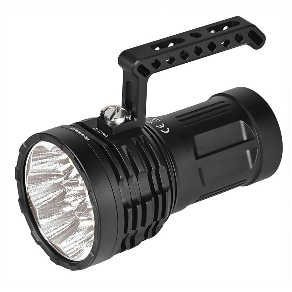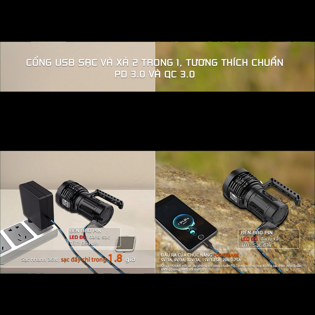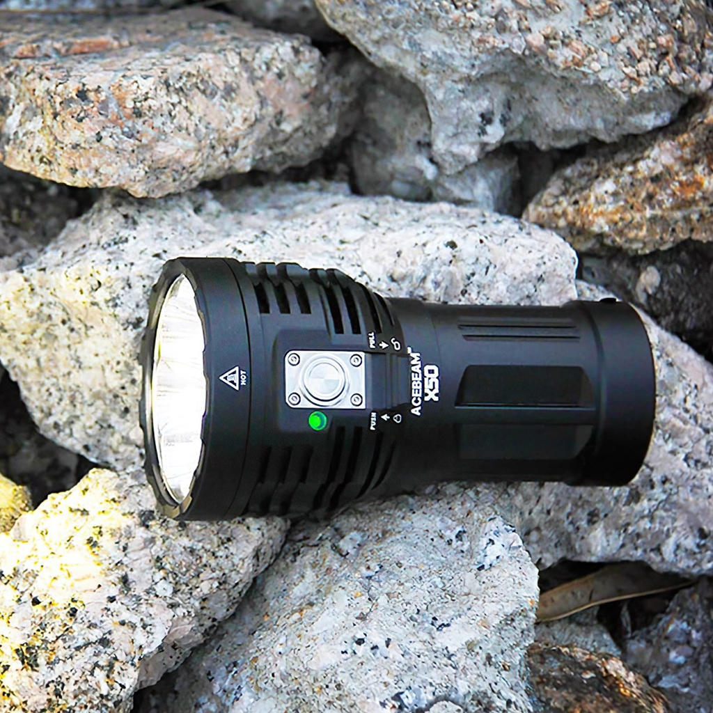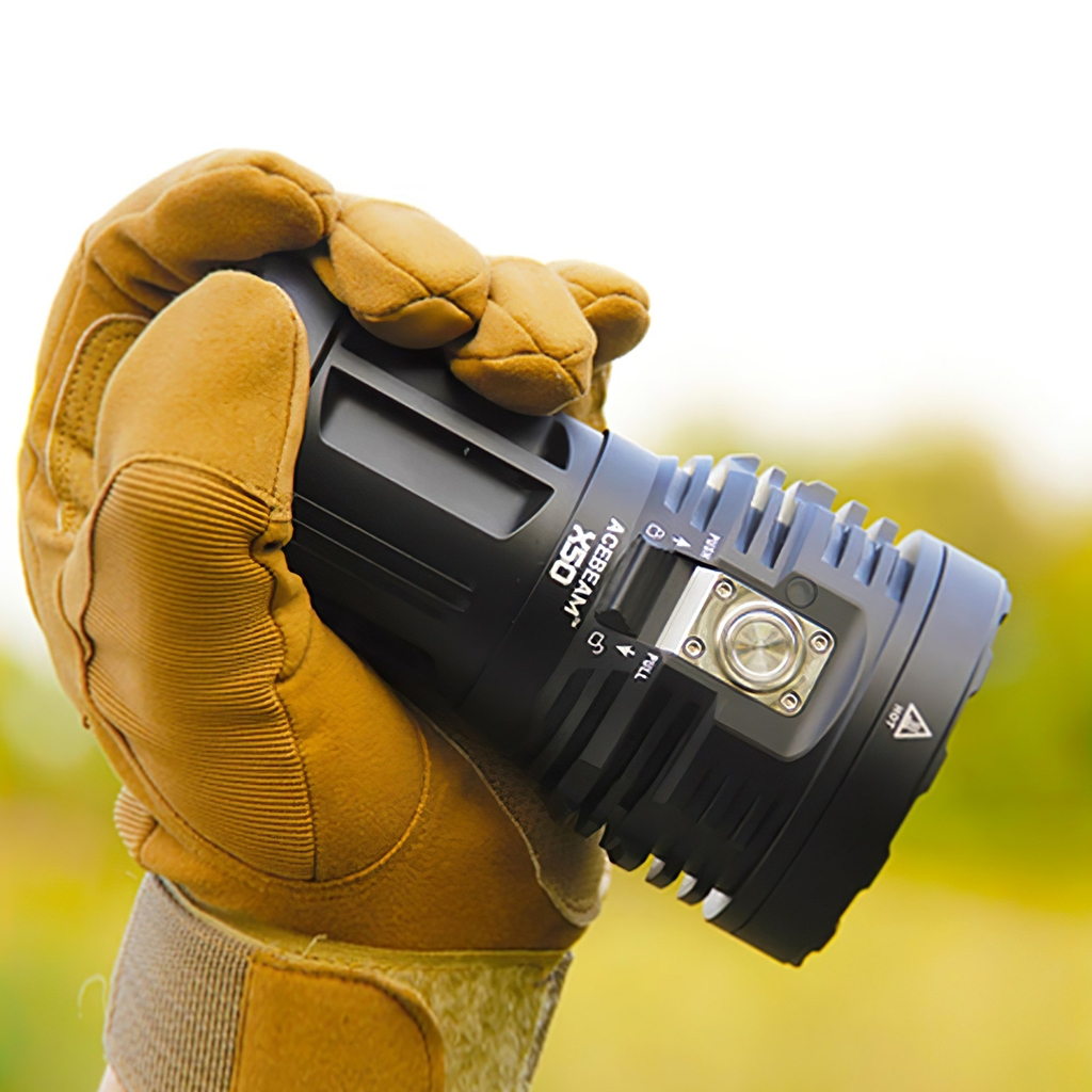 Đèn pin siêu sáng ACEBEAM X50 CRI 95 phiên bản nhiệt màu 4500K có độ hoàn màu rất cao (CRI-95). ACEBEAM X50 là một trong những cây đèn tìm kiếm cứu hộ - cứu nạn mới nhất, độ sáng tối đa có thể lên tới 21.000lumens và khả năng chiếu xa đạt 494mét. Đèn sử dụng bộ pin Li-ion 10.8V / 4250mAh tích hợp ở thân đèn, trang bị tính năng sạc thông minh với cổng sạc USB Type-C, người dùng có thể sạc đầy Acebeam X50 chỉ trong 1,8 giờ. ACEBEAM X50 có chức năng xả như một bộ sạc dự phòng có thể dùng làm nguồn sạc cho điện thoại di động và các thiết bị điện khác với mức tối đa công suất 36W. Đèn được trang bị thêm các tính năng nổi bật như lỗ gắn chân tripod tiêu chuẩn giúp người dùng gắn đèn lên tripod hay các giá đỡ cho ngàm của tripod, công tắc đơn bằng thép không gỉ và chức năng khóa cơ an toàn. Góc chiếu tỏa 120 độ rất phù hợp với các hoạt động tìm kiếm một khu vực rộng lớn, trang trại hoặc nhà kho, tìm kiếm cứu nạn.
