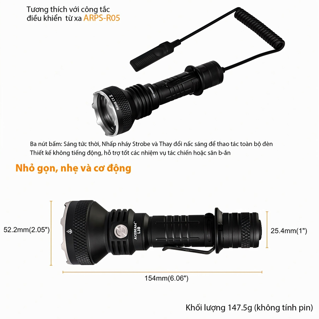 Đèn pin chiếu xa ACEBEAM L18 là cây đèn pin chuyên dụng thế hệ mới có tầm chiếu xa rất ấn tượng trong một kích thước nhỏ gọn - Điều mà trước đây chưa từng hãng đèn nào làm được. Với kích thước rất nhỏ gọn, đầu đèn chỉ hơn 5cm, Acebeam L18 cho độ sáng tối đa 1.500 lumen, và tầm chiếu lên tới 1.000m, điều mà trước đây chỉ những cây đèn to, đầu đèn cỡ tối thiểu 7cm mới làm được. Đèn sử dụng 01 pin sạc Li-ion 217000 dung lượng 5100mAH, dung lượng cao cho thời gian chiếu rất dài, tối đa lên tới 94 ngày. Được thiết kế với thấu kính TIR lớn cho quầng sáng tập trung, mạnh mẽ và vẫn mịn, cân bằng. Cây đèn pin mạnh mẽ này phù hợp với công việc tìm kiếm cứu n ạn, lực lượng thực thi luậ t phá p, đi biển, s ă n b ắ n và các hoạt động dã ngoại.