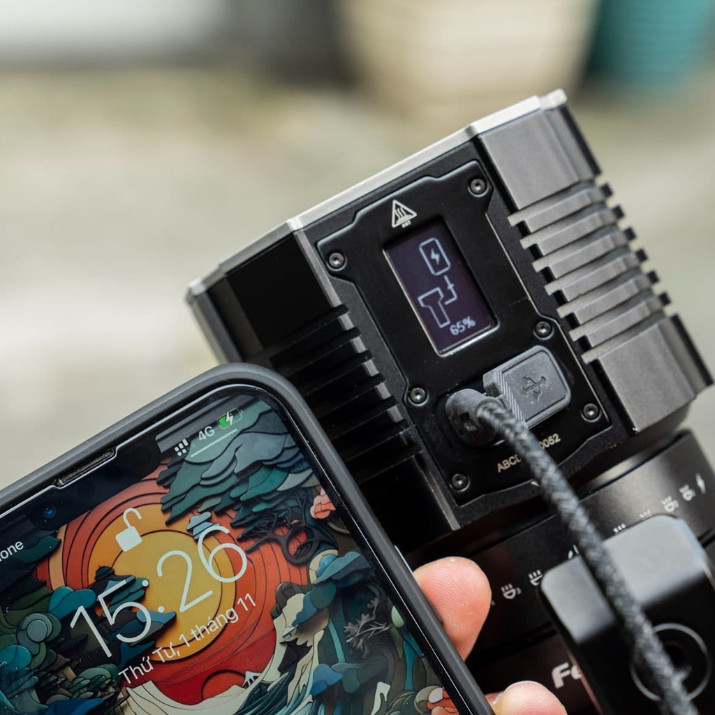 Fenix LR60R trang bị cùng lúc 2 cổng sạc USB 2.0 và Type C với khả năng sạc nhanh 45W. Chỉ cần 1.5 giờ để sạc đầy khối pin 16.000mAh (3.7vol).