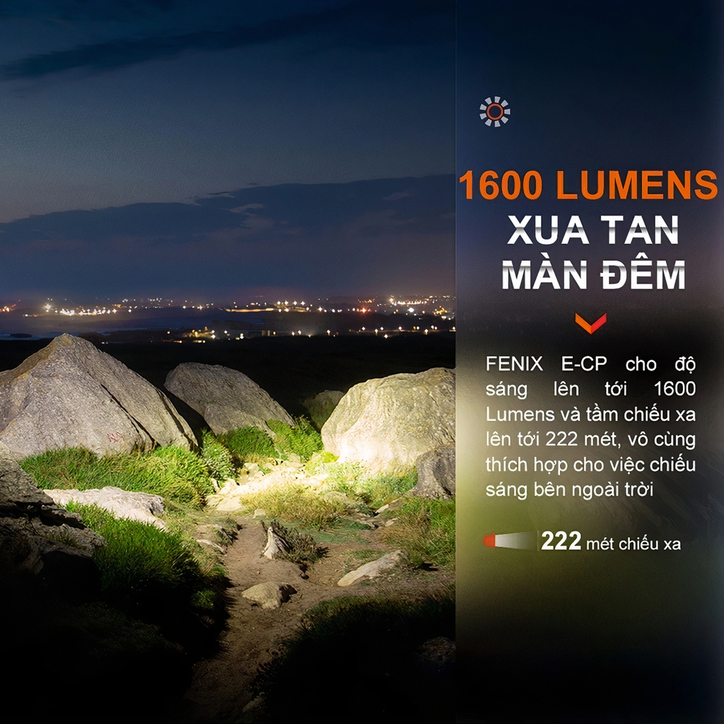 - Turbo: 1.600 lumen; 2.5 tiếng; 222 m