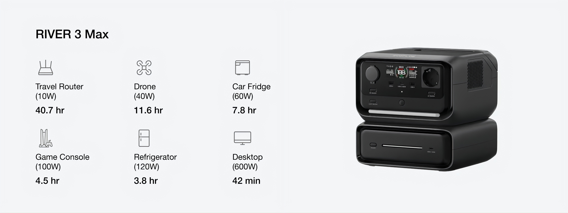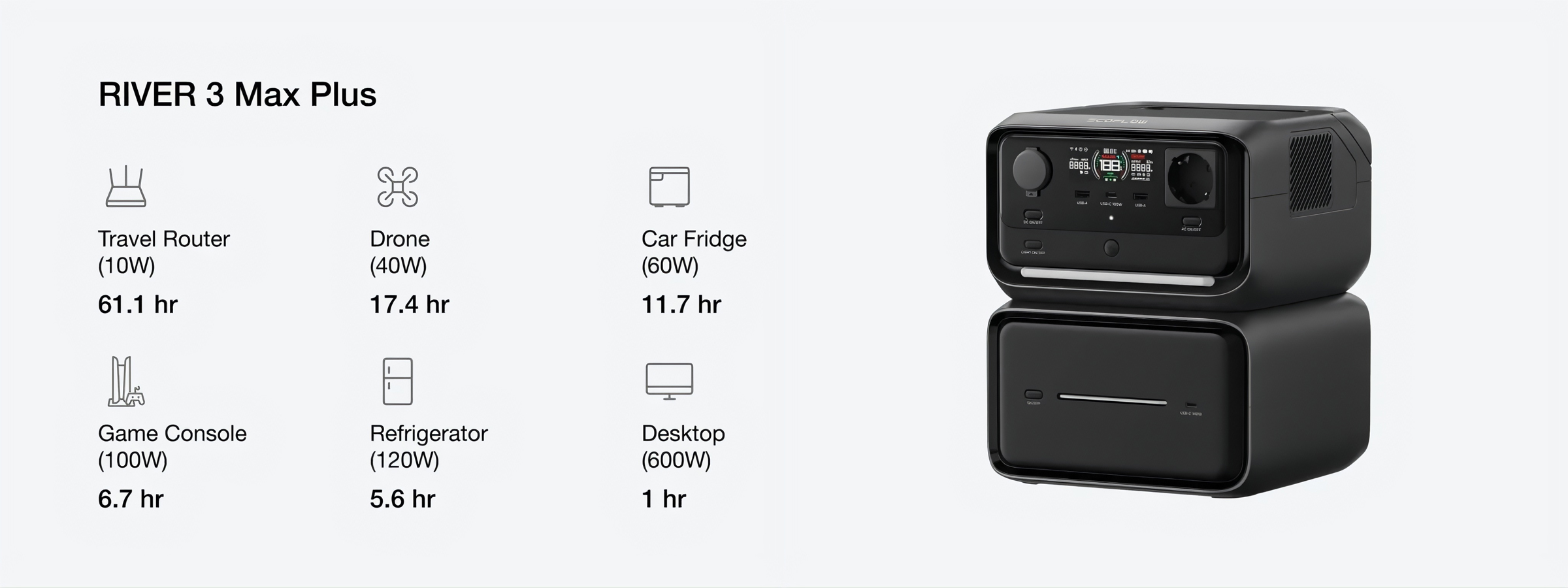 Sức mạnh của bạn với RIVER 3 Mã Plus bao gồm thêm 1 viên pin EB600 (572Wh), chỉ cần xếp chồng chúng để có được tới 858Wh năng lượng thuần túy.
