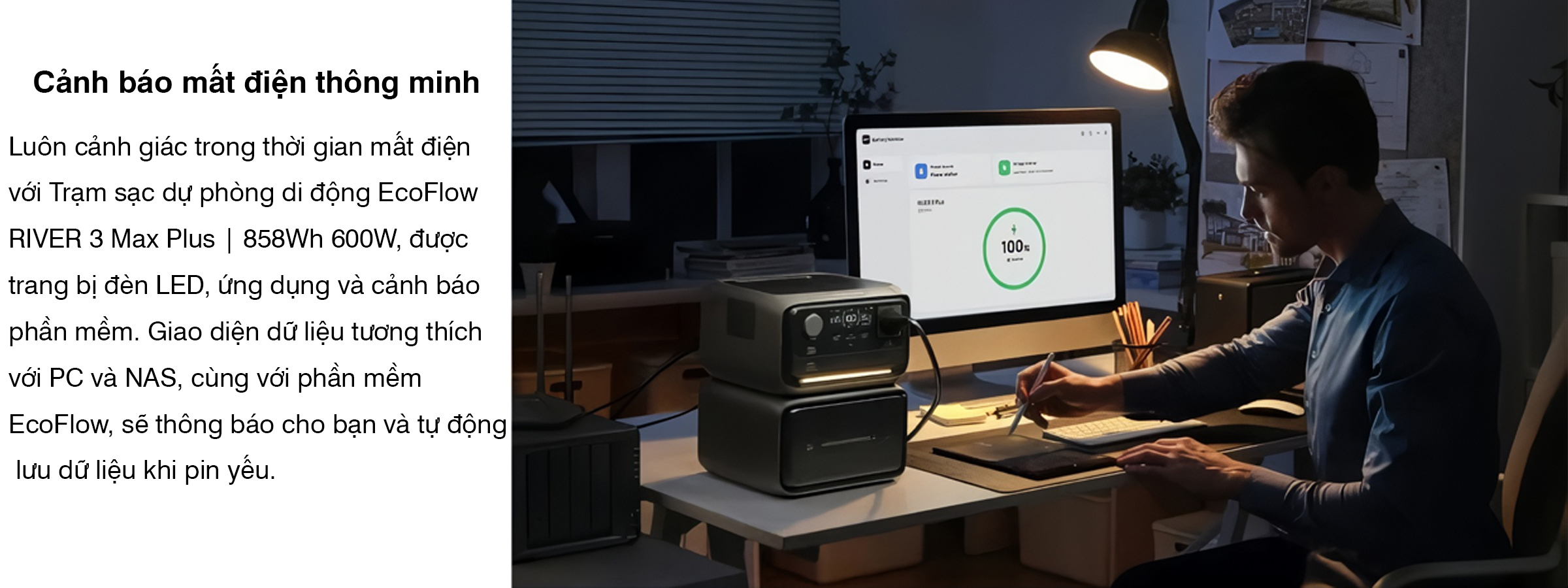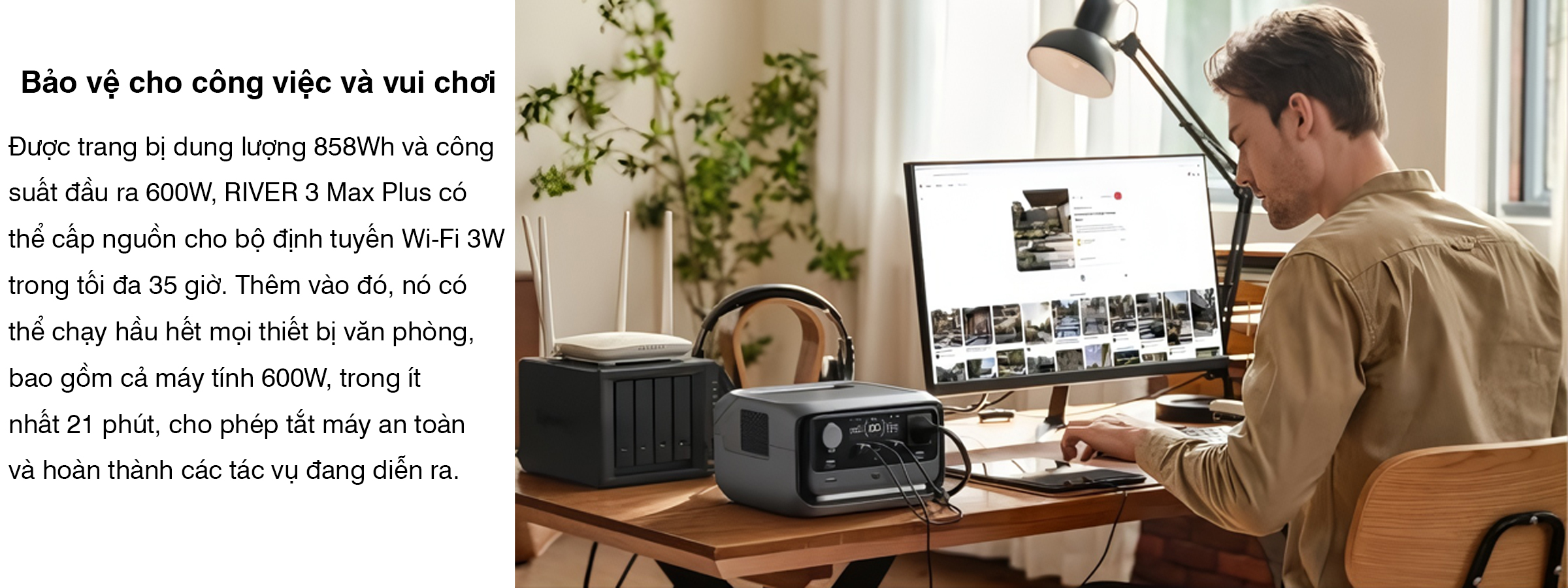 Trạm sạc dự phòng di động EcoFlow RIVER 3 Max Plus | 858Wh 600W mang đến khả năng bảo vệ cao cấp với thời gian chuyển mạch dưới 10 ms, giúp bảo vệ hiệu quả các thiết bị nhạy cảm trong văn phòng tại nhà và hệ thống chơi game trước sự cố mất điện bất ngờ.