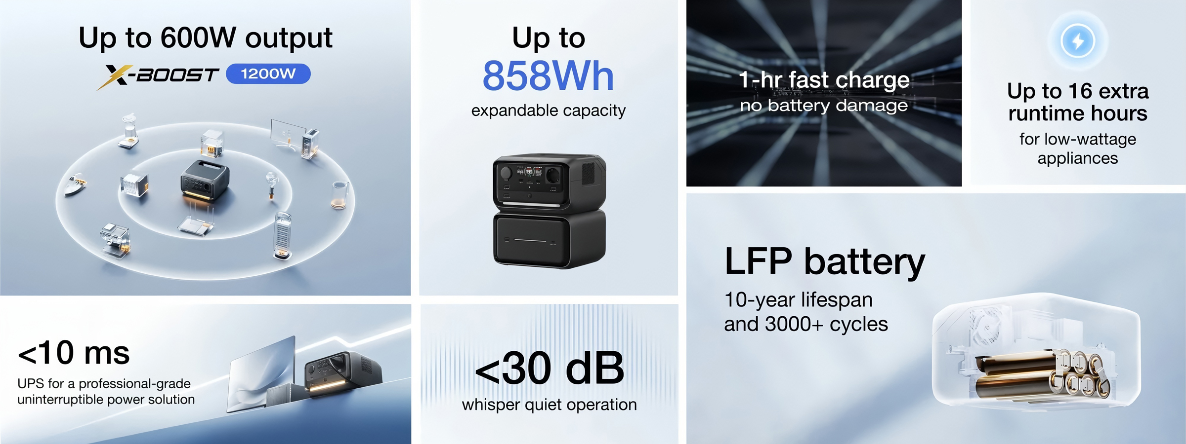 1. Thời gian hoạt động được xác định dựa trên các thử nghiệm trong phòng thí nghiệm với các thiết bị gia dụng phổ biến, ở điều kiện nhiệt độ phòng tiêu chuẩn. Khái niệm “thời gian chạy gấp đôi” được đề cập cụ thể trong các thử nghiệm với thiết bị công suất thấp như đèn 3W hoặc bộ phát Wi-Fi.