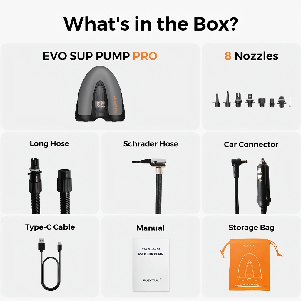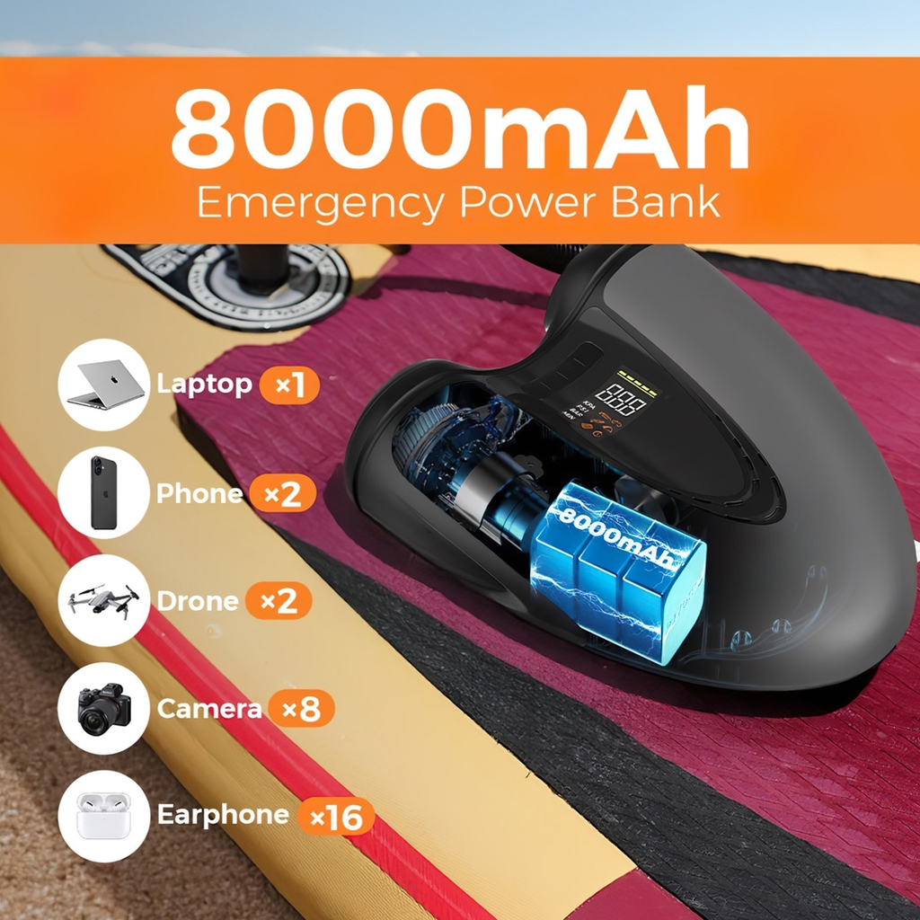 MAX SUP PUMP PRO — máy bơm đa năng chuyên dụng cho SUP và nhiều thiết bị hơi. Với khả năng đạt áp suất lên đến 45 PSI, hệ thống 2 giai đoạn tự động, cùng 6 chế độ thông minh cho các mục đích bơm/nhả khí khác nhau. Máy tích hợp pin 8000 mAh, vừa làm máy bơm, vừa có thể dùng như power bank dự phòng khi cần. Hiển thị áp suất theo thời gian thực với độ chính xác 0,1 PSI, tự động ngắt khi đạt mức cài đặt — cực kỳ tiện lợi trong mọi chuyến đi chơi xa.