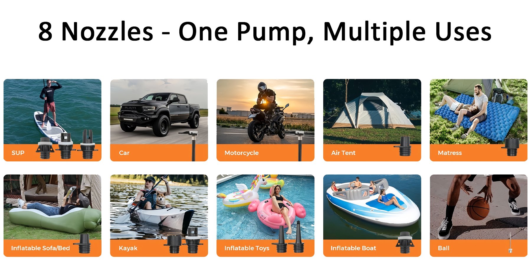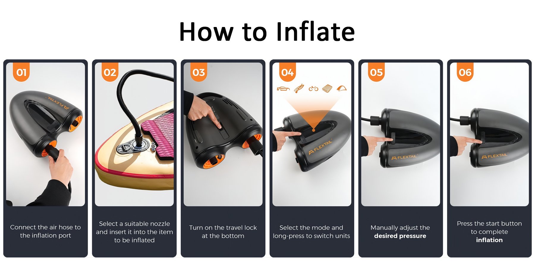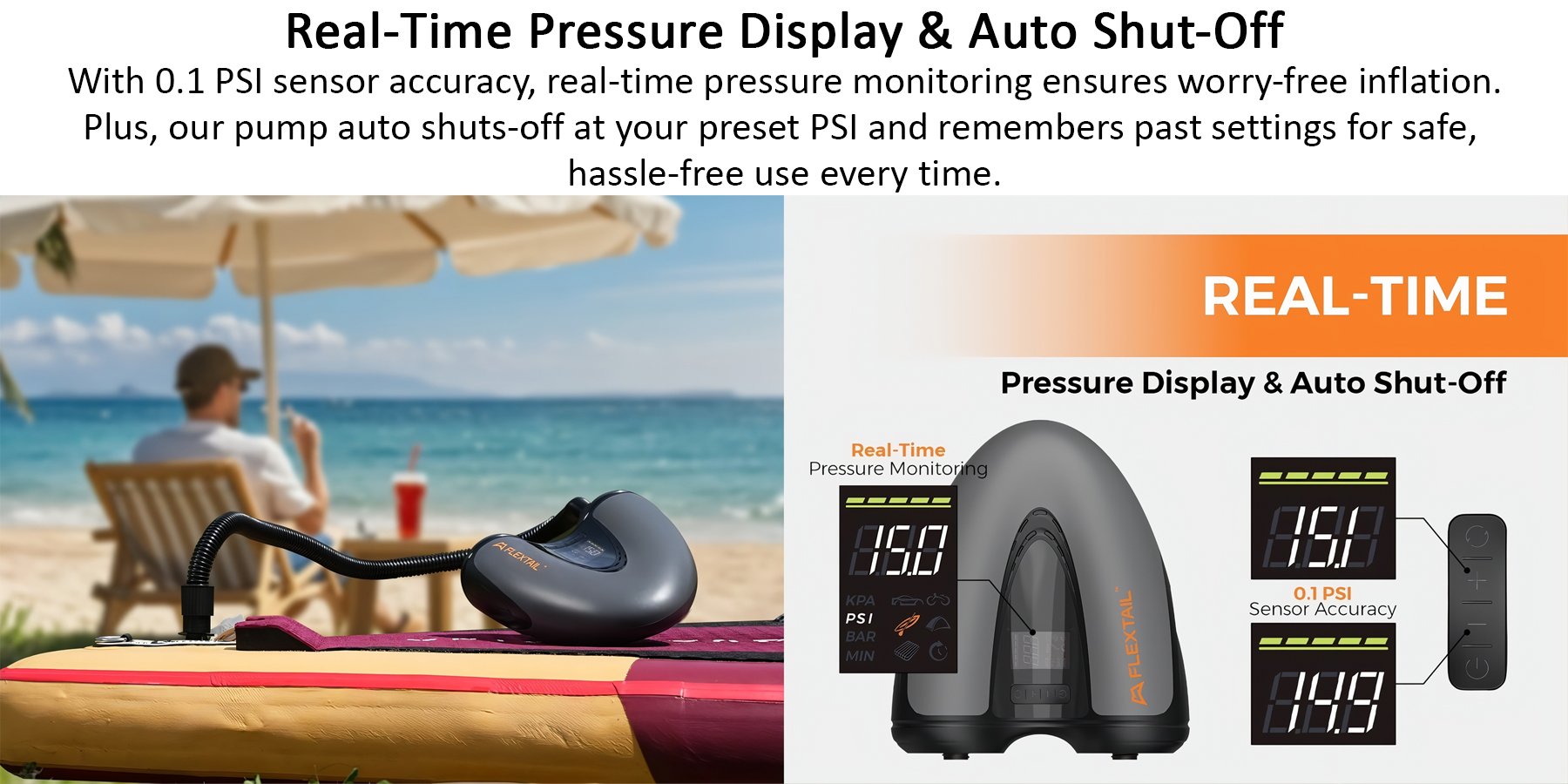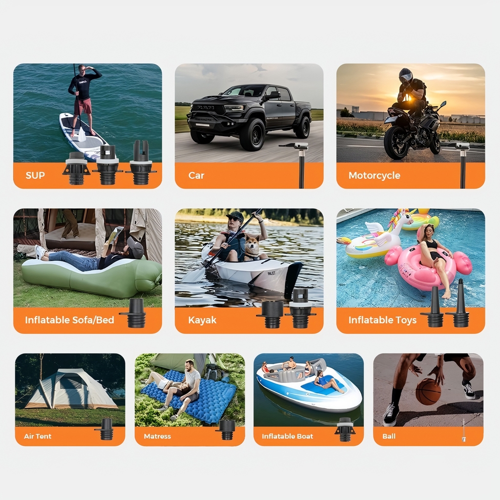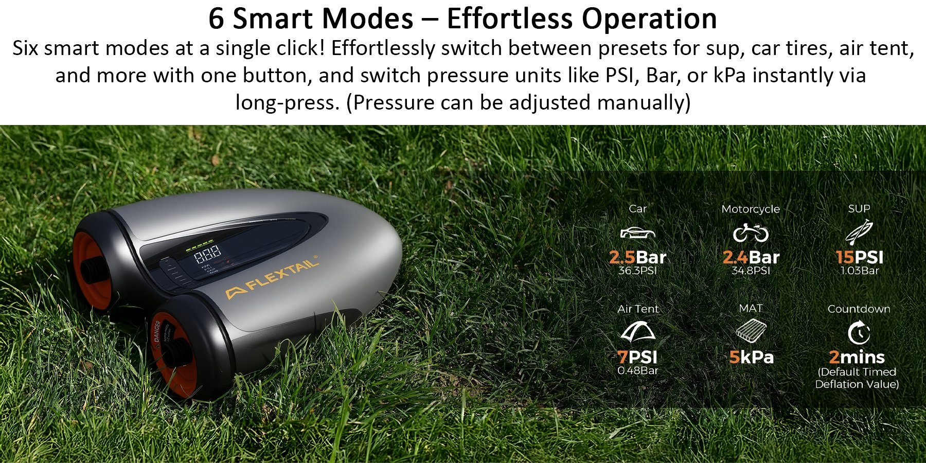6 chế độ thông minh chỉ với một cú chạm! Dễ dàng chuyển qua các chế độ có sẵn như SUP, lốp xe hơi, lều hơi và nhiều hơn nữa bằng một nút bấm. Giữ nút lâu để đổi đơn vị áp suất giữa PSI, Bar hoặc kPa cực nhanh.