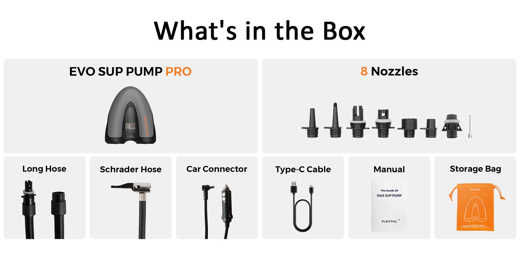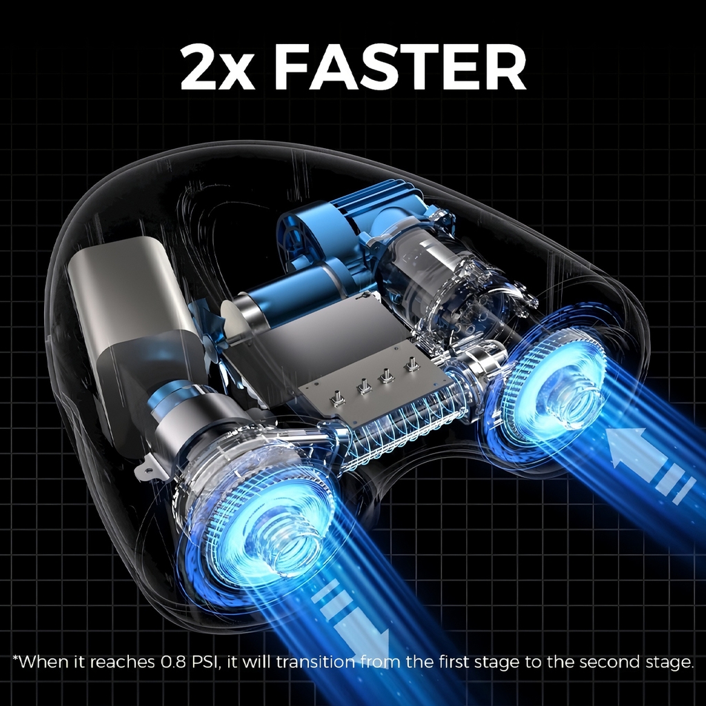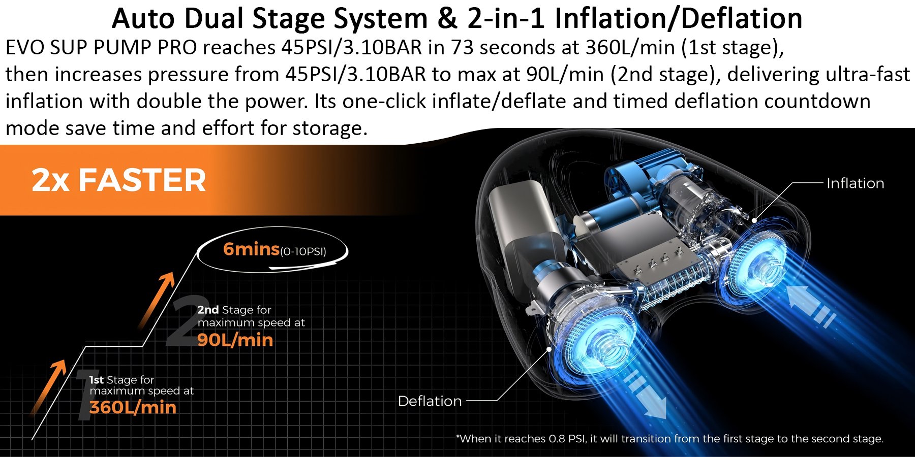 EVO SUP PUMP PRO đạt 45 PSI / 3.10 BAR chỉ trong 73 giây với tốc độ 360L/phút (giai đoạn 1), sau đó tự động tăng áp từ 45 PSI / 3.10 BAR lên mức tối đa ở 90L/phút (giai đoạn 2) – cho tốc độ bơm siêu nhanh, mạnh gấp đôi thông thường.