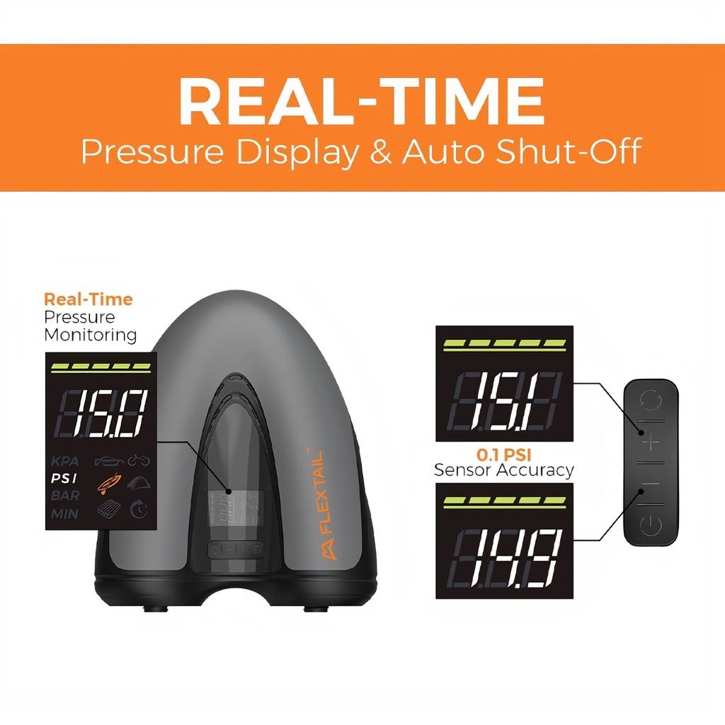 Với độ chính xác cảm biến 0.1 PSI, máy theo dõi áp suất thời gian thực giúp bạn bơm chuẩn xác, không lo quá tay.