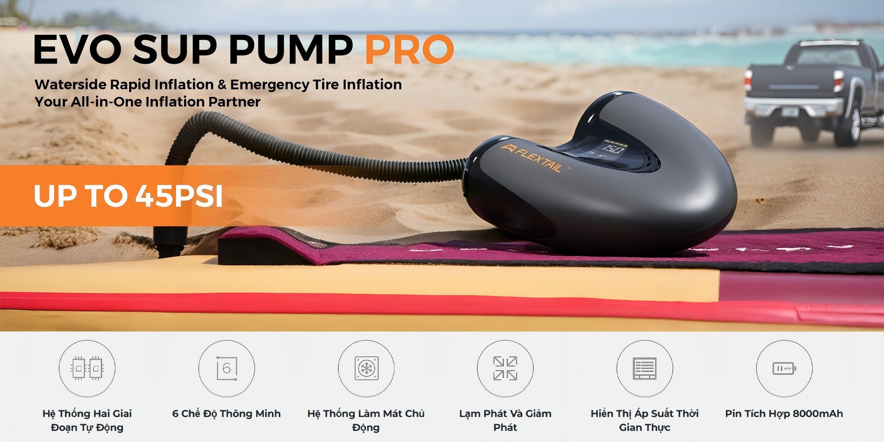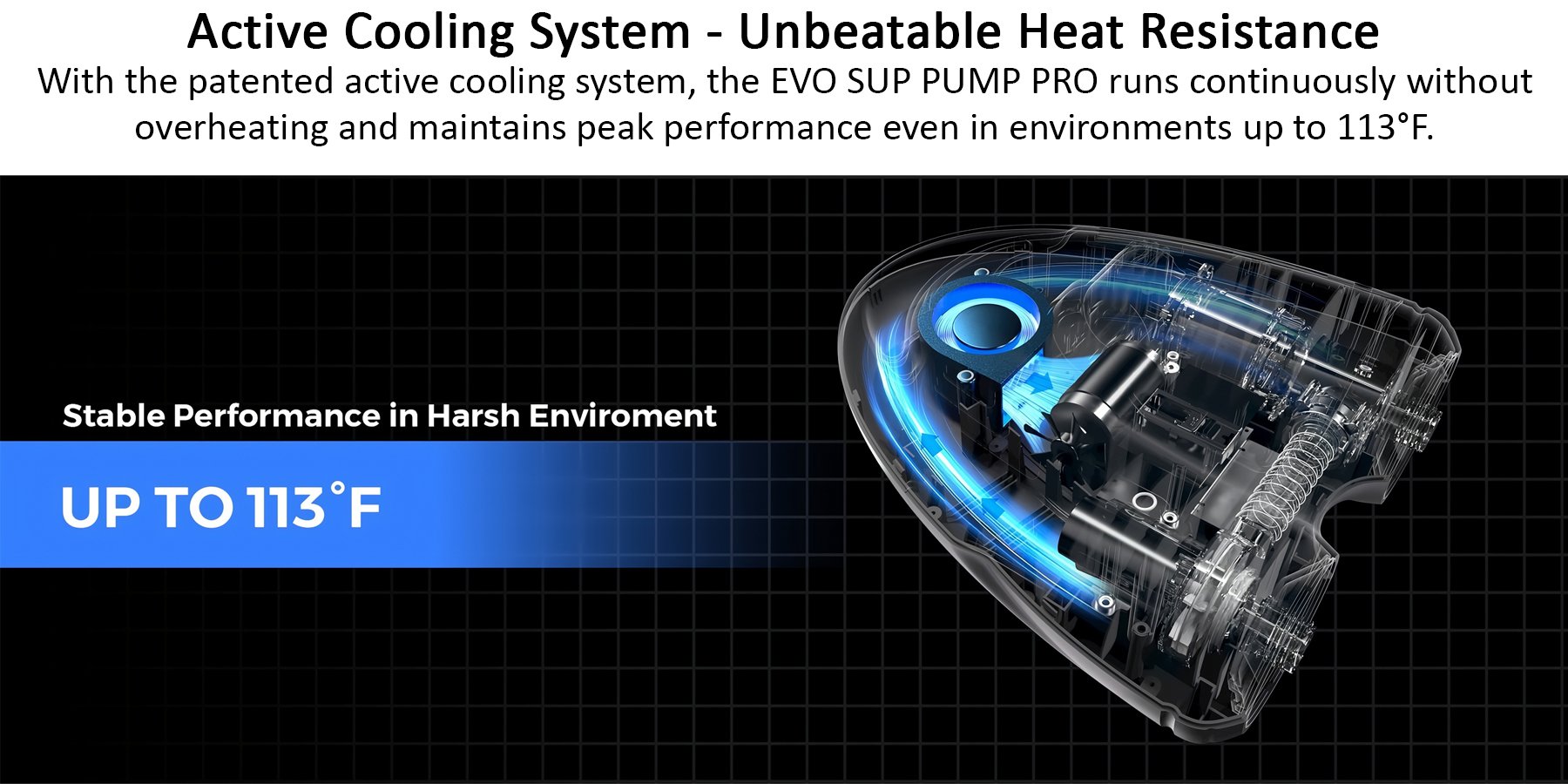 Trang bị công nghệ làm mát chủ động độc quyền, EVO SUP PUMP PRO chạy bền bỉ không sợ nóng, hiệu suất luôn ổn định ngay cả khi trời tới 45°C!
