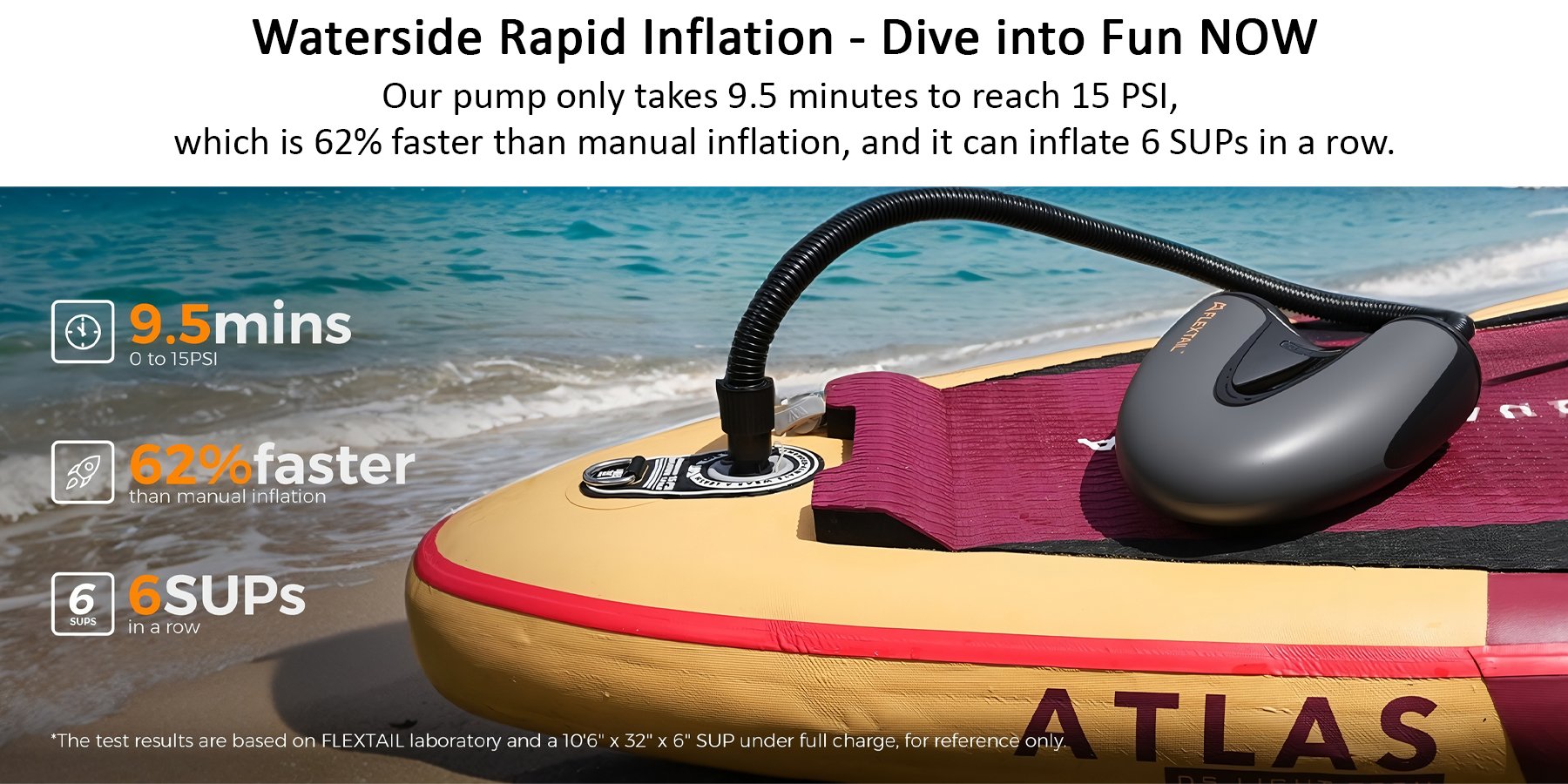 Bơm chỉ mất 9,5 phút là đạt 15 PSI, nhanh hơn bơm tay tới 62%! Một lần sạc bơm liền 6 ván SUP, khỏi lo mất sức!