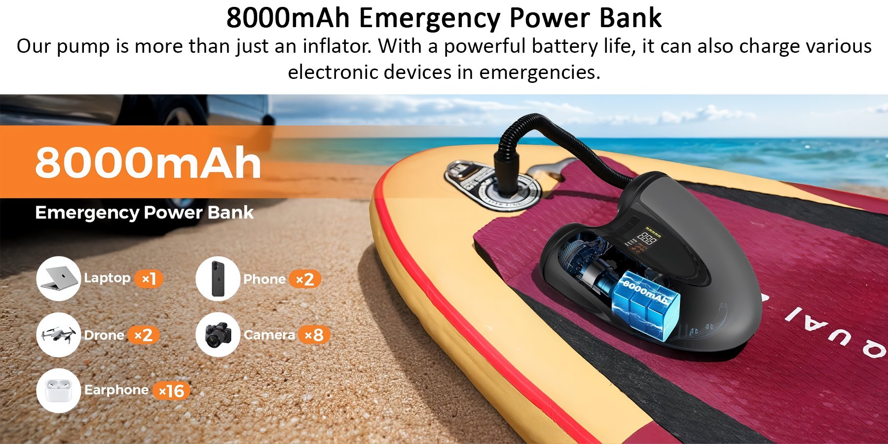 Không chỉ là một chiếc máy bơm – với dung lượng pin mạnh mẽ, nó còn có thể sạc cho nhiều thiết bị điện tử khi cần thiết.