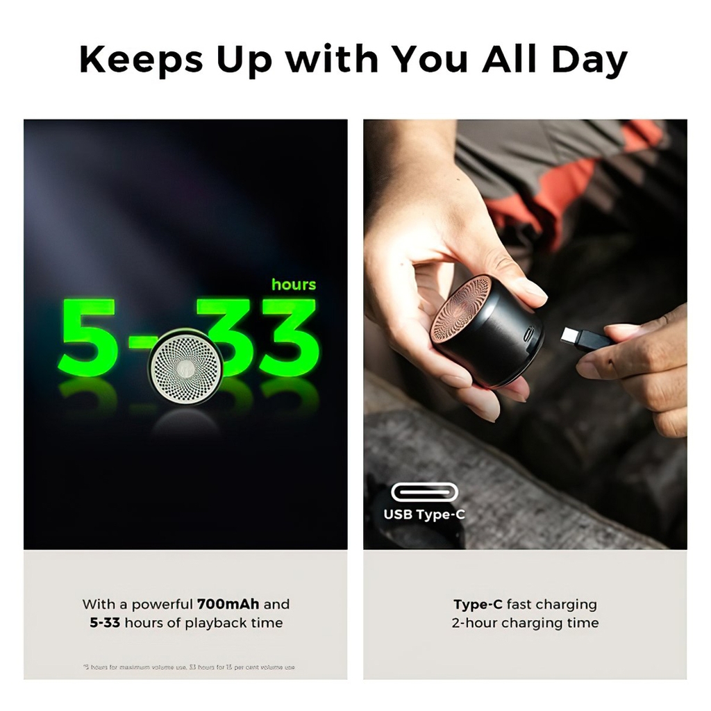 Với thiết kế mini hoàn toàn bằng kim loại và dây đeo ngoài trời tiện dụng, loa có thể kích hoạt chỉ bằng một cú nhấp chuột và cung cấp thời gian phát nhạc từ 5-33 giờ chỉ với một lần sạc. Tiny Speaker là người bạn đồng hành âm nhạc hoàn hảo cho cả những cuộc phiêu lưu ban ngày và những đêm thư giãn.