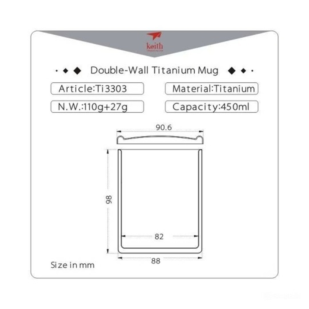 Keith Titanium Ti3303 Cốc 2 Lớp Có Nắp 450Ml được làm từ titan nguyên chất, bền bỉ và chắc chắn. Thiết kế tinh tế: Thiết kế hai lớp, cách nhiệt và không nóng, nắp cốc một lớp bằng titan nguyên chất không bịt kín, trọng lượng nhẹ, không có khóa, dễ dàng mang theo