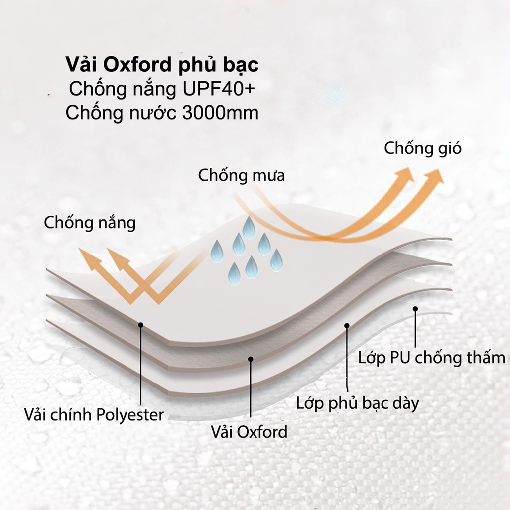 Lớp ngoài chất liệu vải Oxford 150D phủ bạc chống nước 3000mm, chống tia cực tím UPF50+, bạn hoàn toàn yên tâm tận hưởng cuộc sống ngoài trời mà không cần lo lắng
