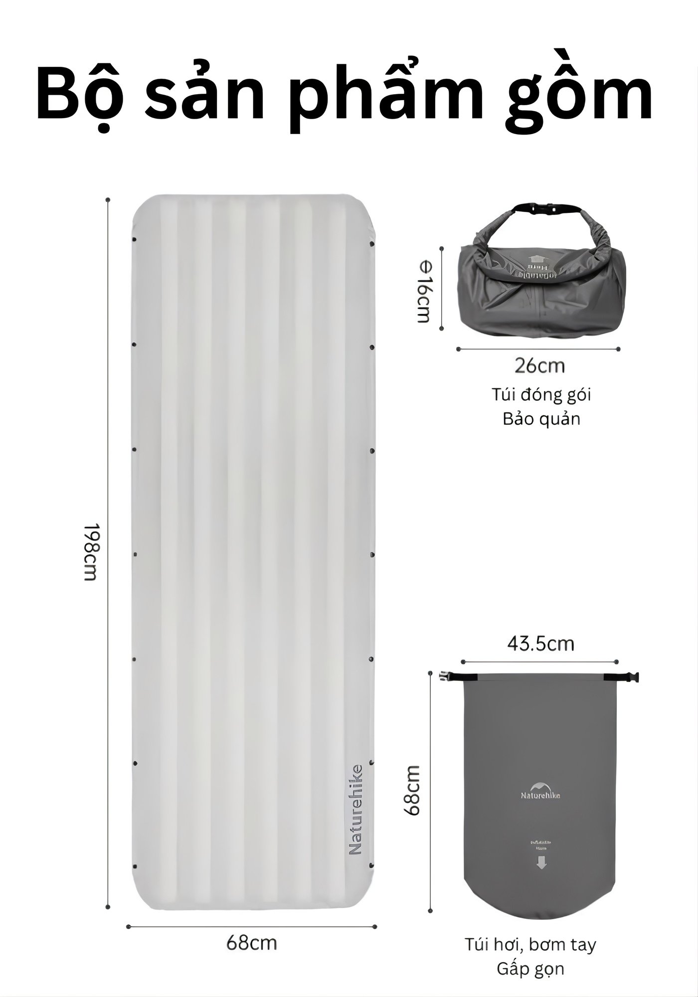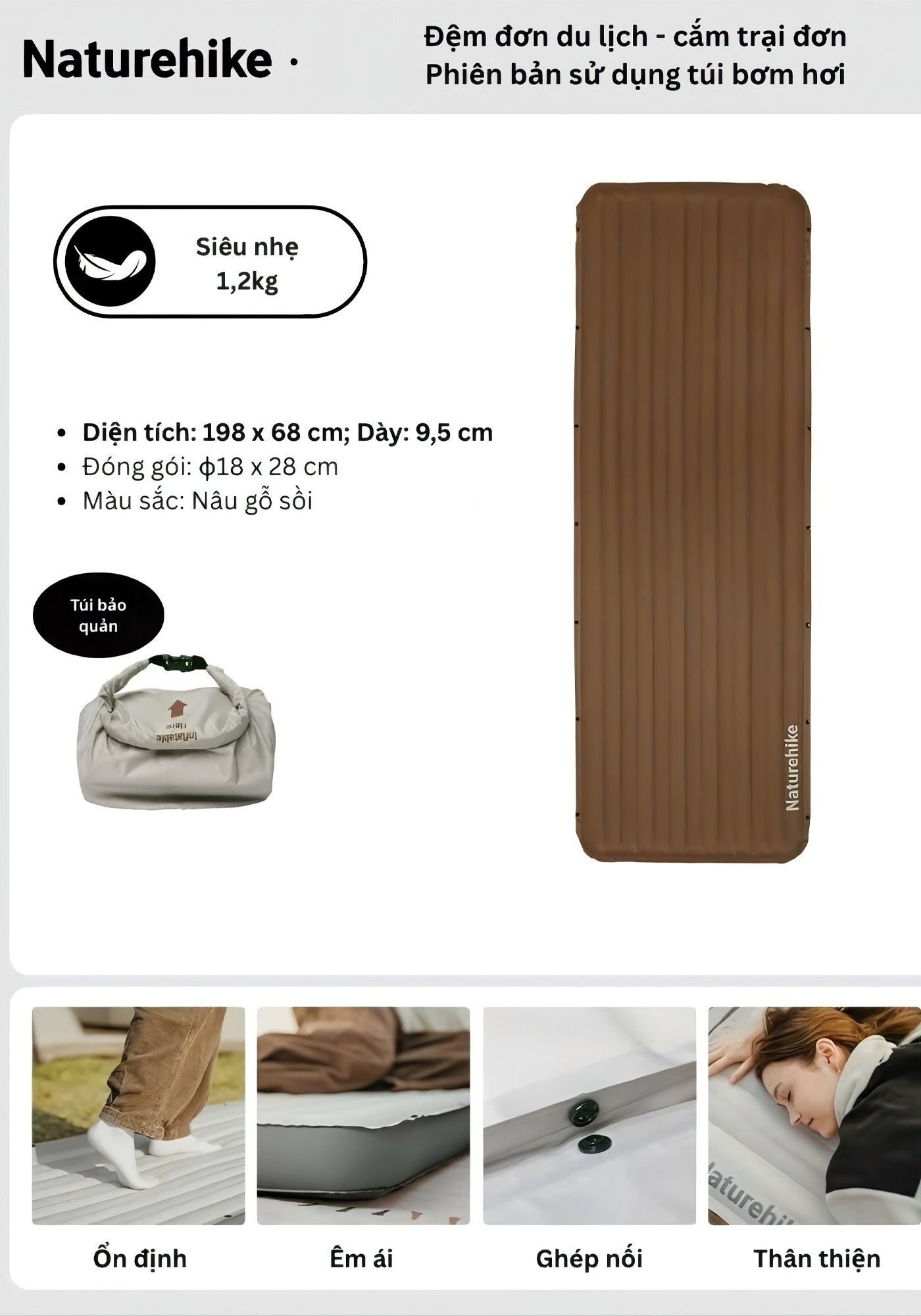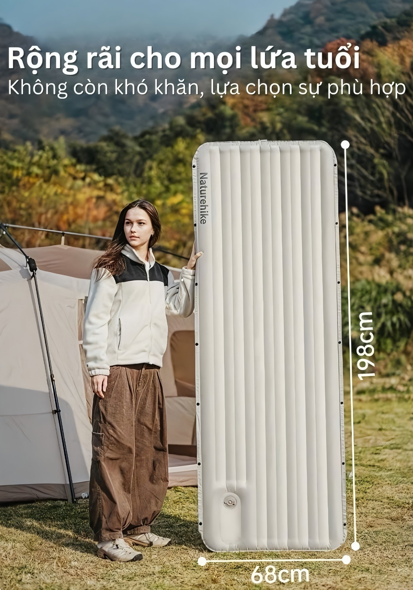 Đệm hơi Naturehike Libamboo CNK2450WS034 mang đến trải nghiệm ngủ dã ngoại hoàn hảo nhờ thiết kế siêu nhẹ và gọn gàng. Với kích thước khi trải rộng đủ lớn và khả năng xếp nhỏ khi cất, sản phẩm là lựa chọn tối ưu cho những chuyến đi rừng, cắm trại hay leo núi. Vật liệu chất lượng cao đảm bảo độ bền và sự thoải mái trong suốt giấc ngủ dưới sao.