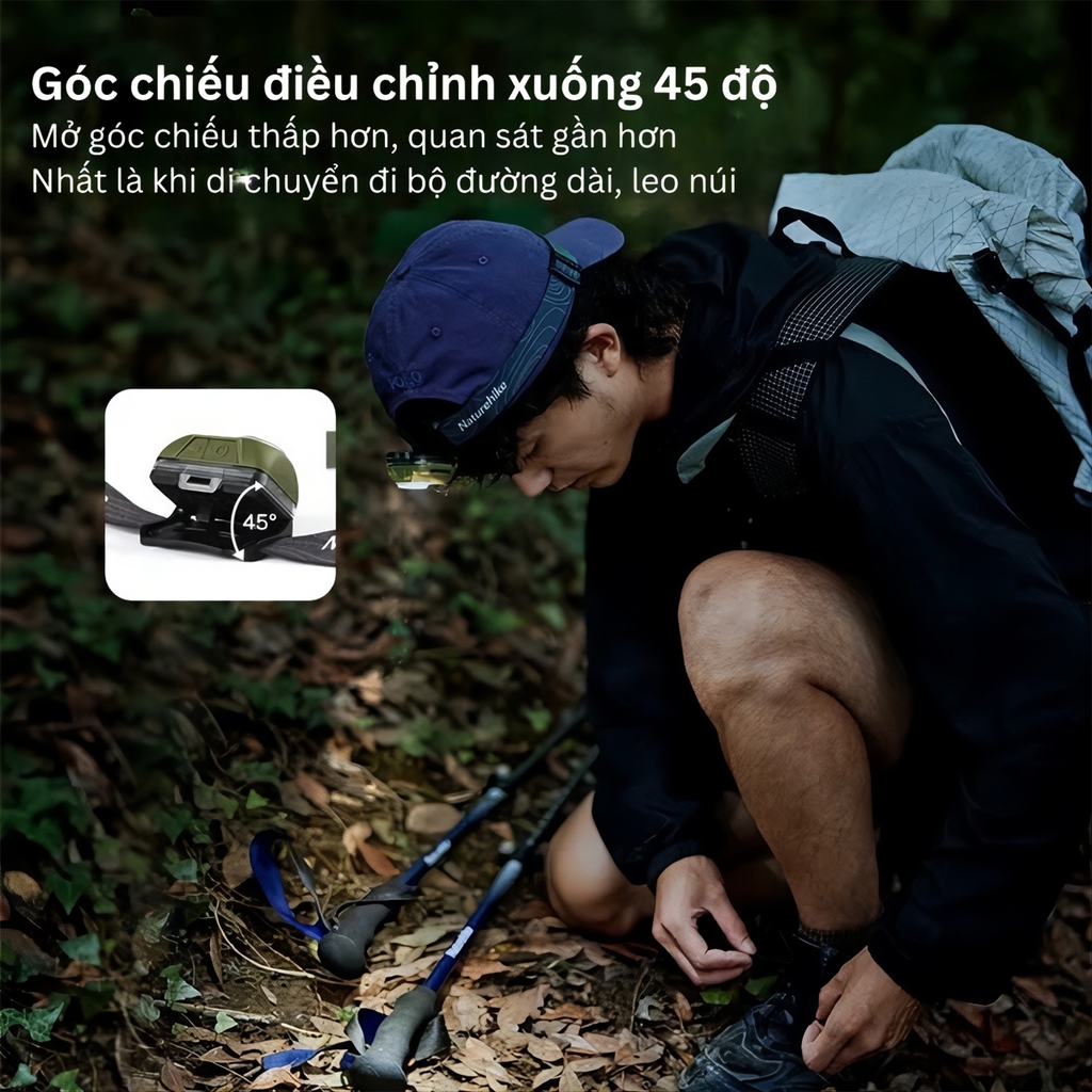 Tính năng Đa dụng: Đèn được trang bị đèn trợ sáng phụ để mở rộng vùng chiếu, tăng khả năng bao quát không gian xung quanh. Đặc biệt, bạn có thể điều chỉnh góc chiếu sáng xuống 45 độ để tối ưu hóa vùng quan sát gần, rất cần thiết khi Trekking, leo núi hoặc chạy địa hình hiểm trở.