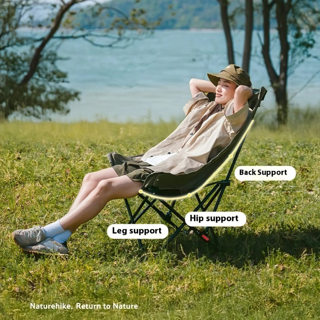 Ghế gấp thư giãn Naturehike CNK2550JJ019 được thiết kế dựa trên phong cách Moon Chair, mang đến khả năng nâng đỡ tối ưu cho lưng, hông và đùi – những vị trí thường chịu áp lực lớn khi cơ thể thả lỏng. Nhờ đó, người dùng dễ dàng đạt được trạng thái thư giãn thoải mái, nghỉ ngơi trọn vẹn sau hành trình dài.