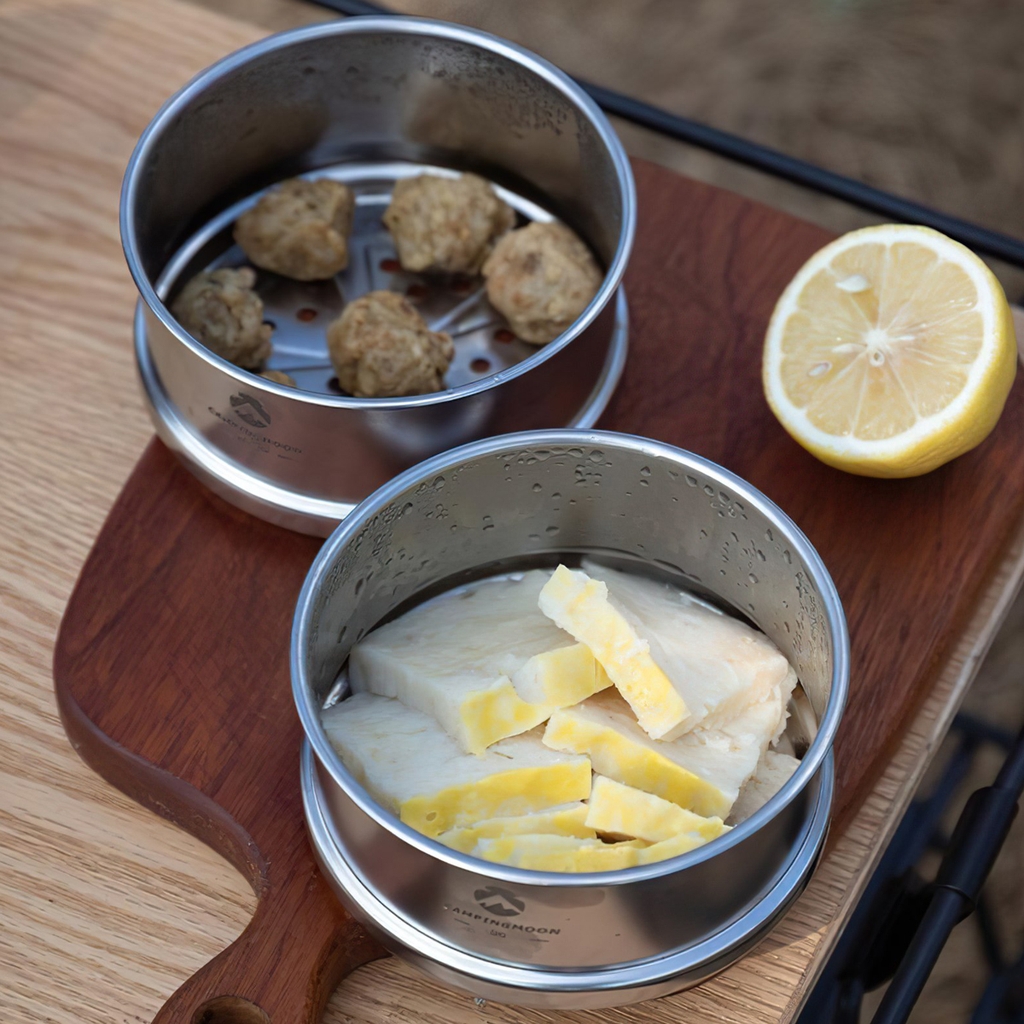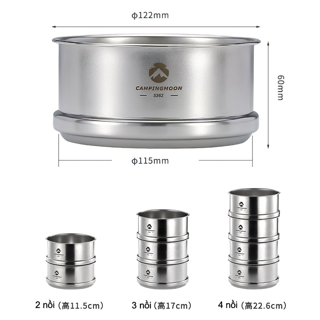 Nồi/ Xửng hấp cắm trại Sierra mini Campingmoon S362 chất liệu Inox 304 không gỉ sét, dễ lau chùi. Có thể xếp chồng nhiều lớp nhiều không gian hơn và hấp nhiều món ăn cùng 1 lúc. Thiết kế nhỏ gọn, nhẹ thích hợp cho các hoạt động ngoài trời như cắm trại, dã ngoại, picnic…