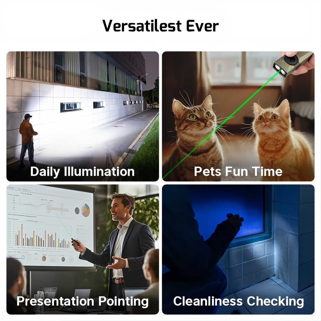 Ba chức năng trong một: Tích hợp ánh sáng trắng, tia UV và laser xanh lá, phù hợp cho nhiều nhu cầu từ chiếu sáng, kiểm tra vật dụng đến sử dụng chuyên dụng.