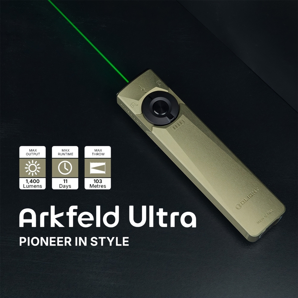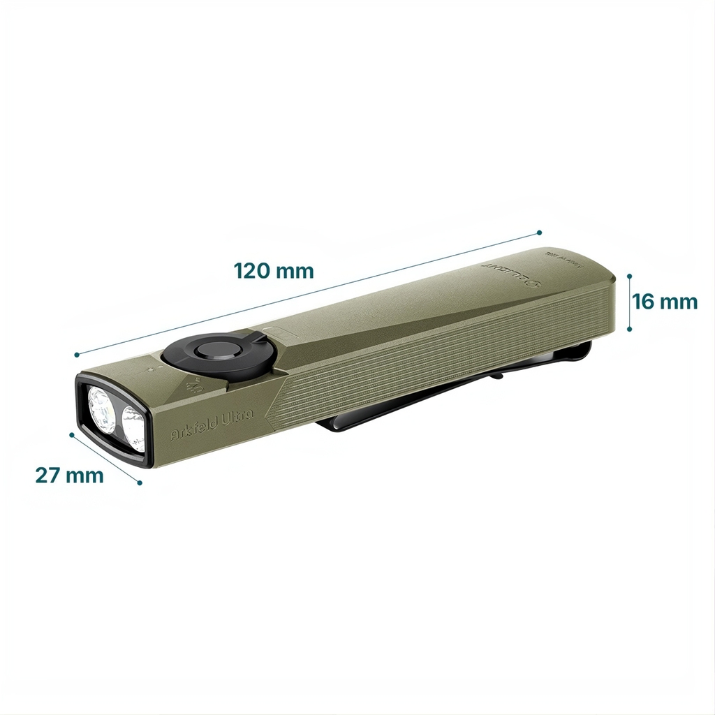 Arkfeld Ultra được làm từ nhôm O-aluminum – vật liệu do Olight phát triển với độ cứng vượt trội, bền hơn nhiều so với nhôm 6061 thông thường, giúp đèn hạn chế trầy xước và mài mòn khi sử dụng hằng ngày. Thiết kế phẳng với các đường nét sắc sảo tạo nên vẻ ngoài khác biệt và đầy cá tính. Sản phẩm tích hợp ba loại ánh sáng: trắng, laser xanh và UV, tất cả đều được chuyển đổi nhanh bằng công tắc tiện lợi. Từ thuyết trình, kiểm tra bề mặt đến sử dụng dã ngoại, Arkfeld Ultra đáp ứng tốt nhiều nhu cầu. Kẹp gài hai chiều cùng thân đèn mỏng gọn khiến việc mang theo trong túi áo, túi quần hay ba lô trở nên cực kỳ dễ dàng.