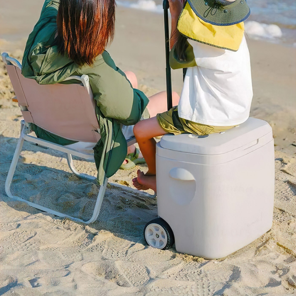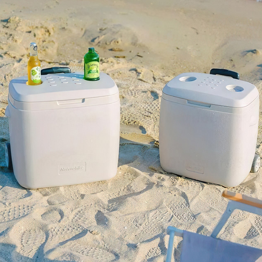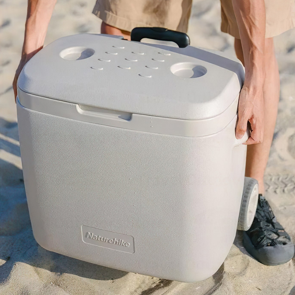 Để gia tăng khả năng sử dụng thùng giữ nhiệt ở các địa điểm khác nhau, nhà sản xuất Naturehike chế tạo thêm chi tiết bánh xe và tay kéo.