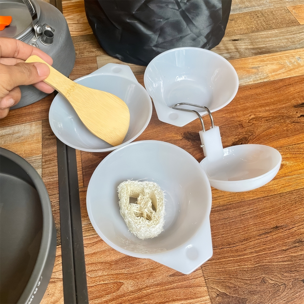 Gọn nhẹ & tiện mang theo: Toàn bộ bộ nồi được xếp gọn thành một khối nhỏ, đi kèm túi lưới (size M) hoặc túi vải (size L) giúp bảo quản và mang theo dễ dàng trong mọi chuyến dã ngoại.