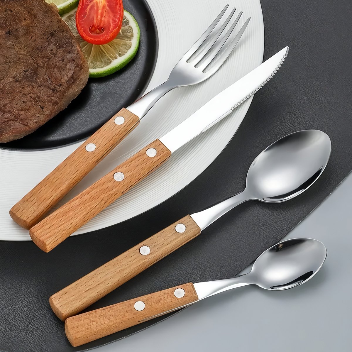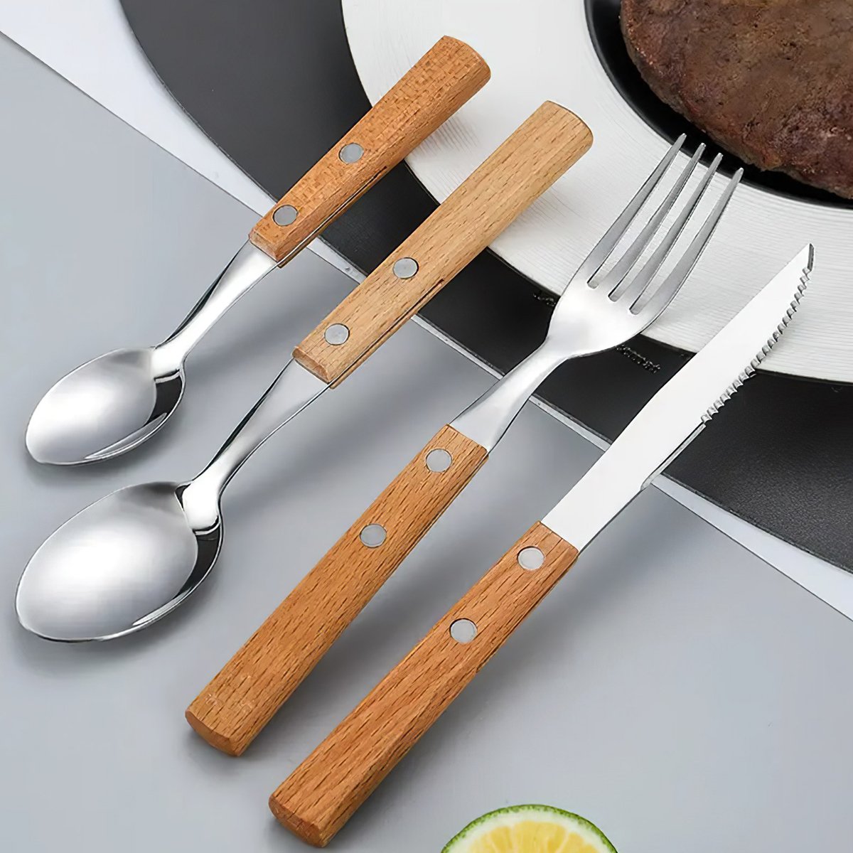 Bộ sản phẩm bao gồm: muỗng ăn, dao ăn, nĩa và muỗng cà phê — đầy đủ cho một set bàn ăn tiện dụng và tinh tế.