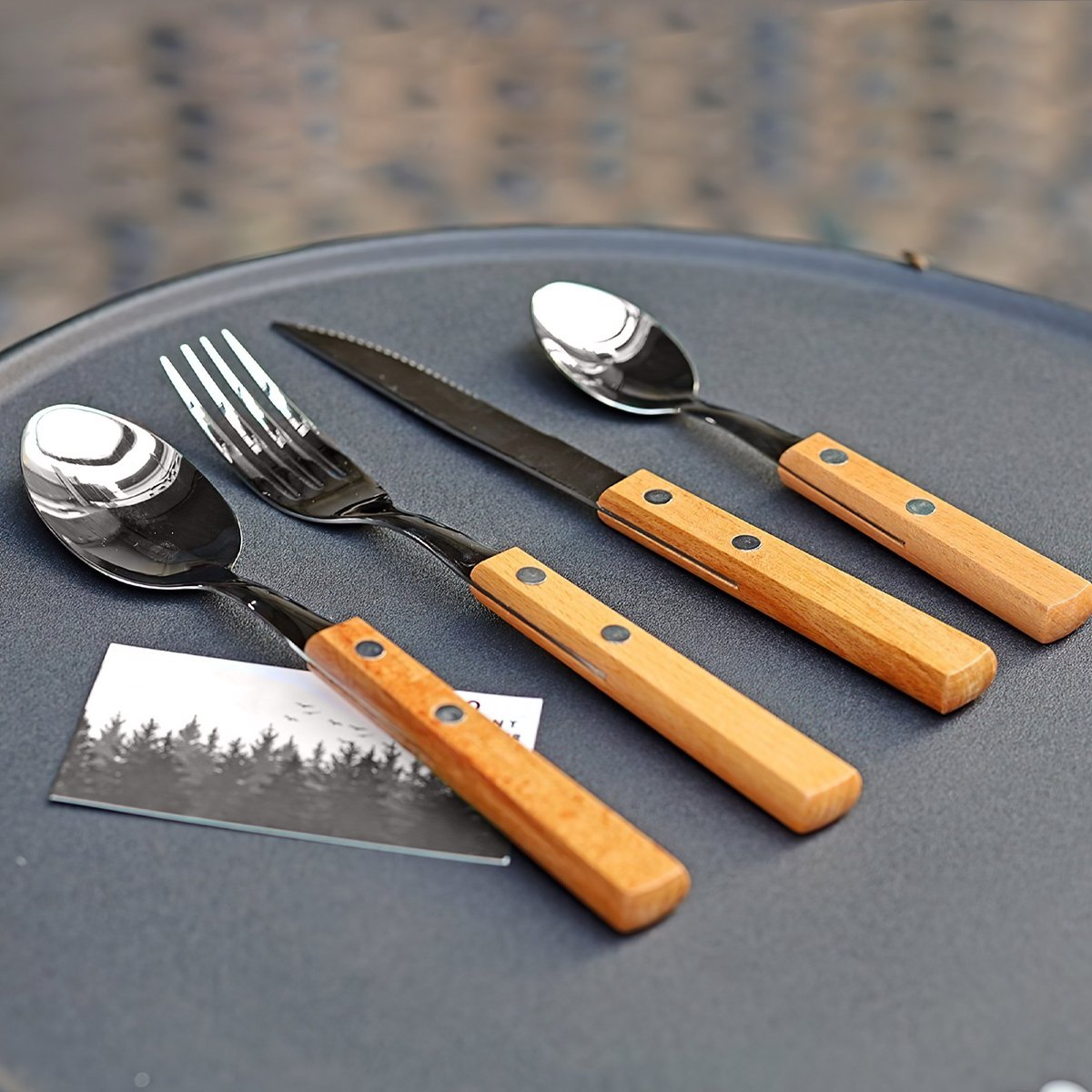Bộ dao, muỗng, nĩa này không chỉ tiện lợi trong sử dụng mà còn đóng vai trò như một món phụ kiện trang trí tinh tế, mang phong cách sang trọng và cổ điển, giúp bàn ăn trong những buổi cắm trại trở nên ấn tượng và đậm chất vintage hơn.