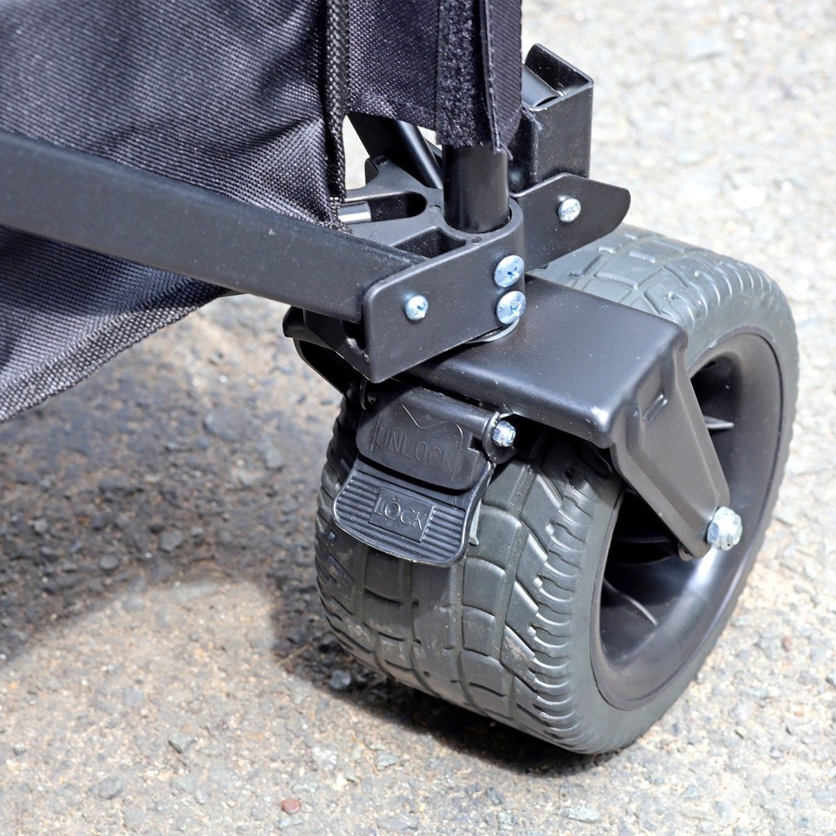 Sử dụng bánh xe bản rộng 10cm, được bọc bằng chất liệu TPE cao su, xe vận hành cực kỳ trơn tru và ổn định, giảm thiểu rung xóc hiệu quả. Ngoài ra, hai bánh trước còn được trang bị khóa an toàn, rất tiện lợi và cần thiết khi dừng xe ở địa hình dốc.